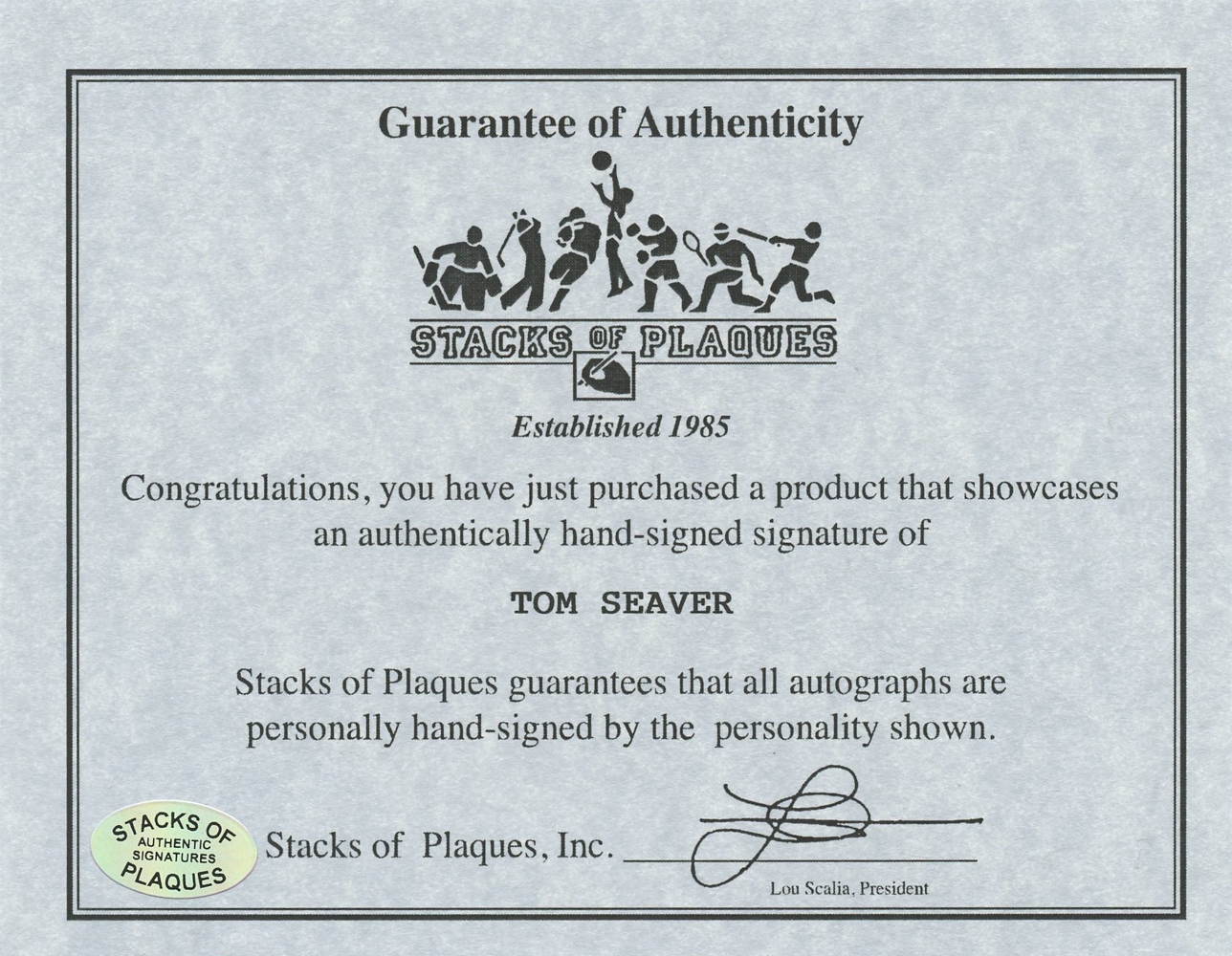 The autograph includes an official Stacks of Plaques - Est. 1985, celebrating 30 years in the business - hologram and matching COA for authenticity purposes.