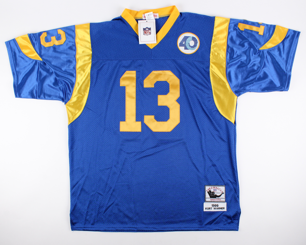 Mitchell & Ness throwback replica jersey. Everything is sewn on, size 54. Hand-signed in black felt tip pen by Kurt Warner (Packers, Cardinals).