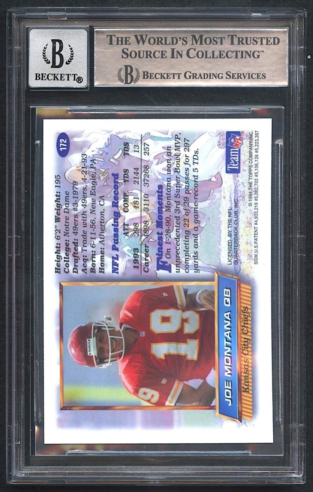 Joe Montana Signed 1994 Finest #172 (Beckett Encapsulated | Autograph Graded 10)
