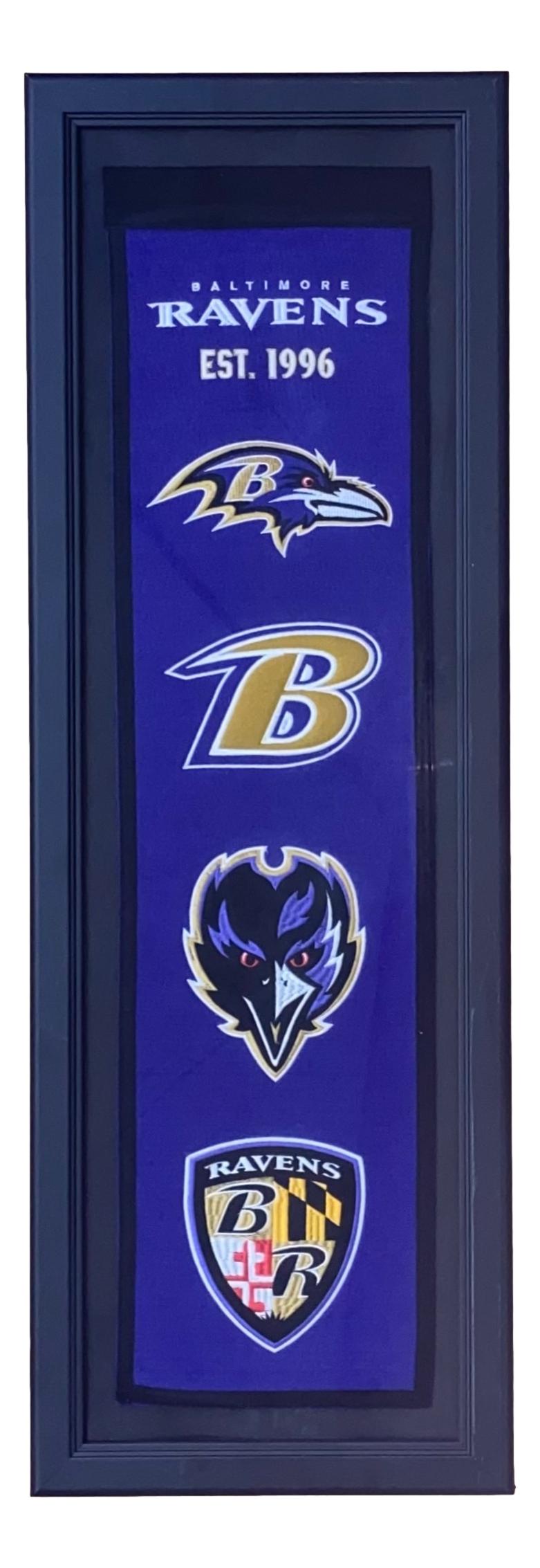Custom frame measures 12" x 38" in size and features a Baltimore Ravens wool blend heritage banner. Please note, this item is unsigned.