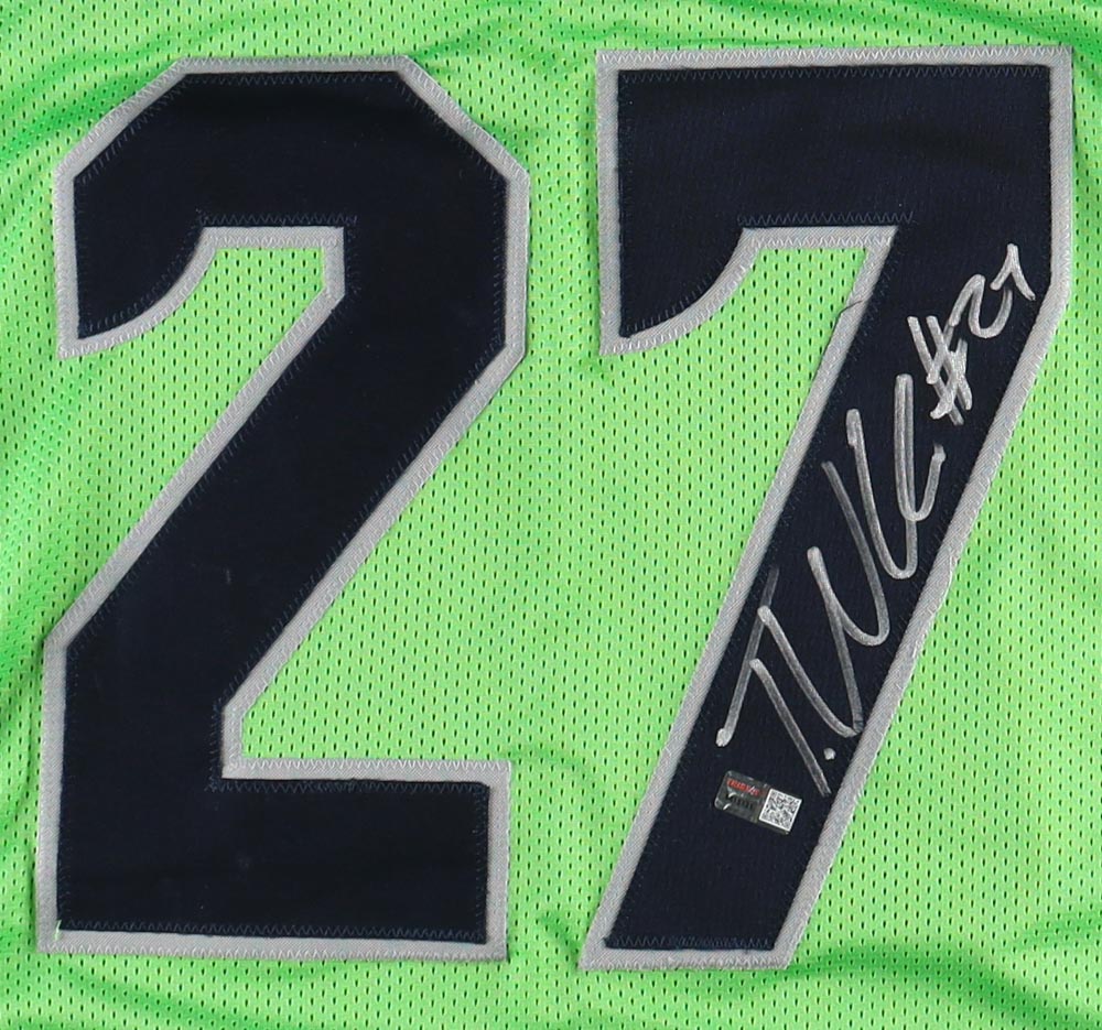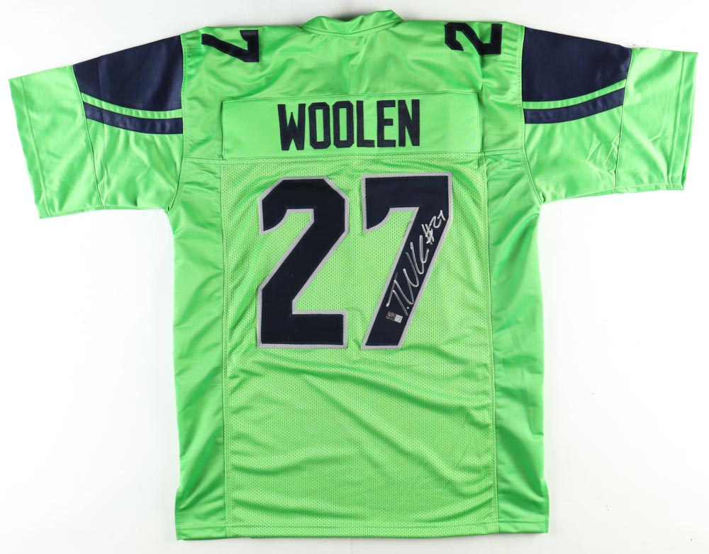 Custom on-field style jersey. Everything is sewn on, size XL. Hand-signed by Tariq Woolen.