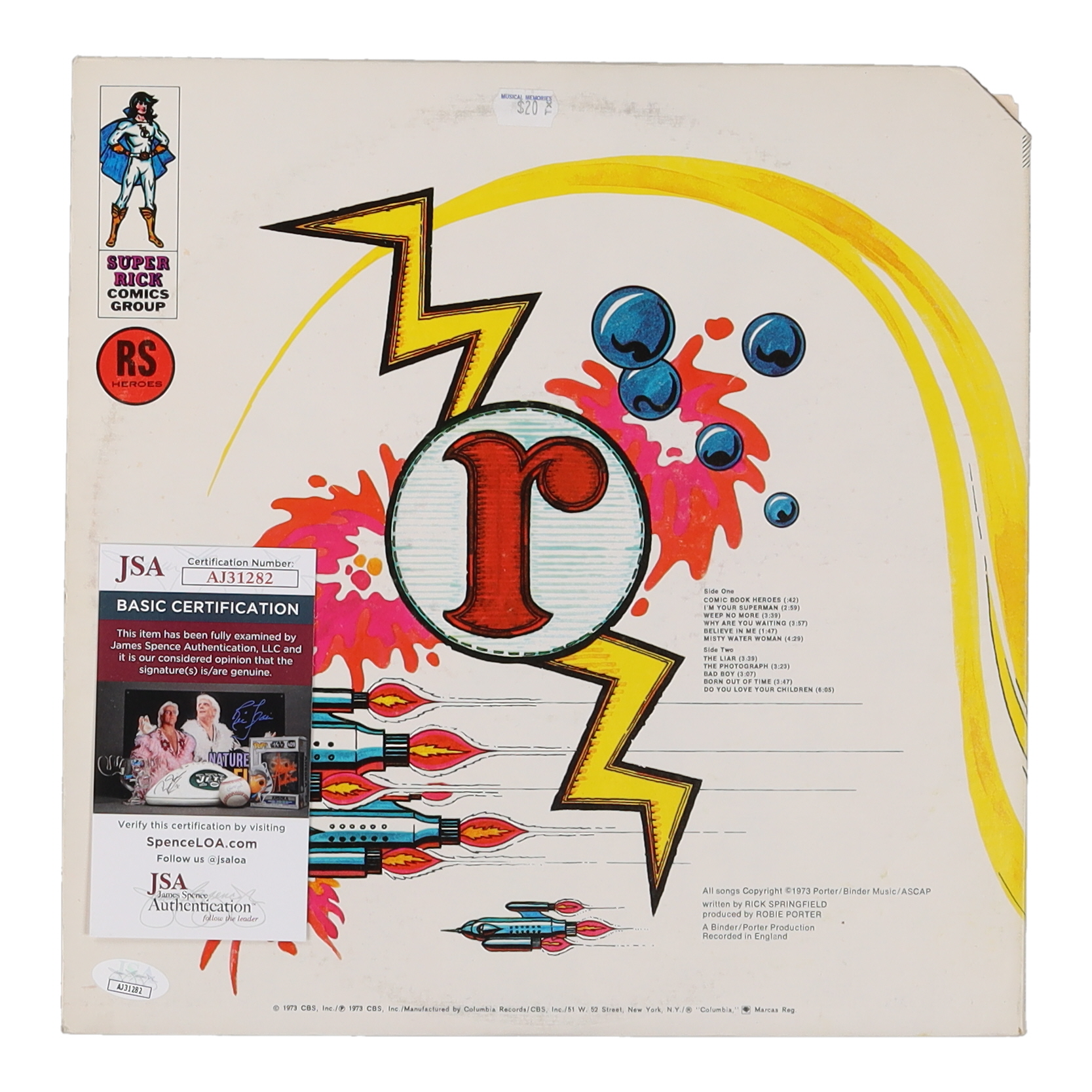 "Comic Book Heroes" vinyl record album has been hand-signed by Rick Springfield. Please note, the vinyl record is included.