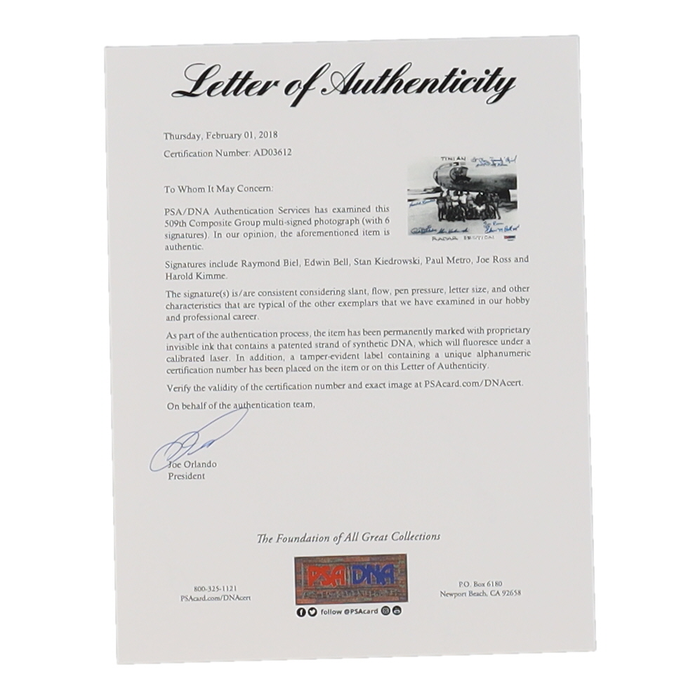 509th Composite Group 5x7 Photo Signed by (6) with Raymond Biel, Edwin Bell, Stan Kiedrowski, Paul Metro with (3) Inscriptions (PSA)