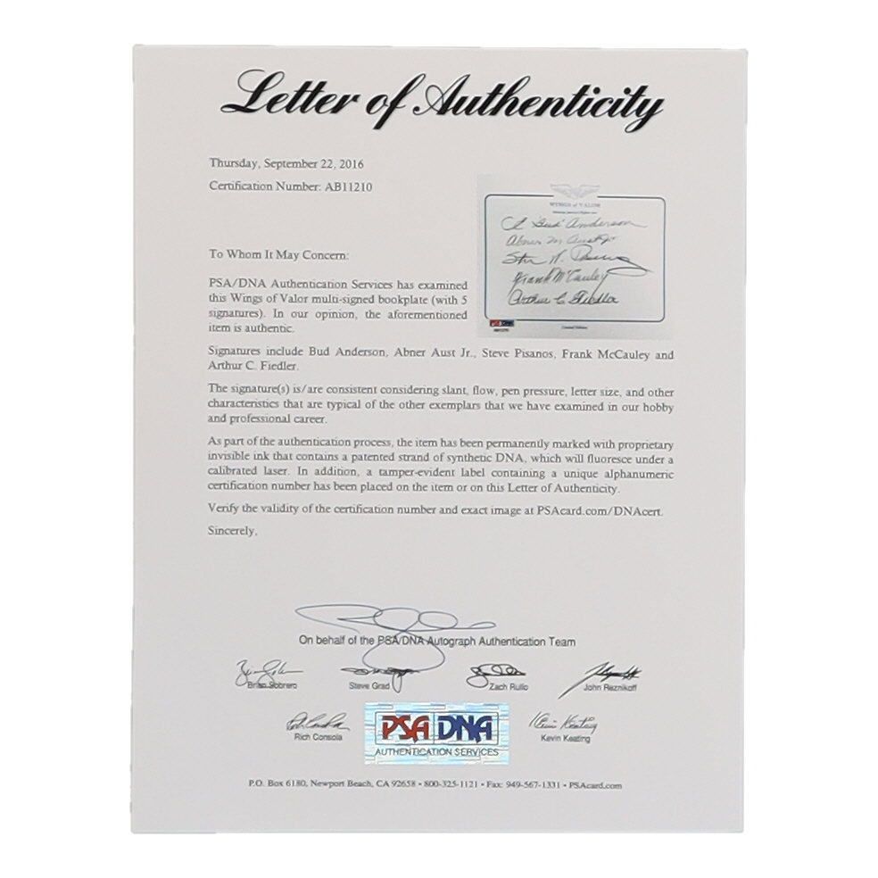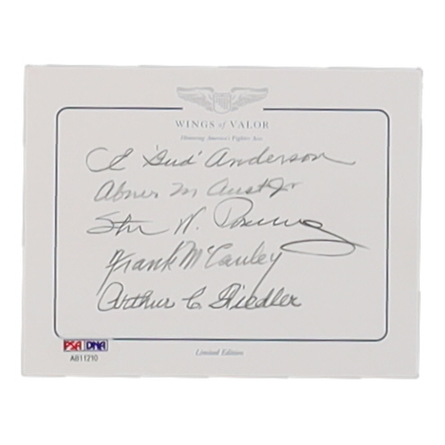 "Wings of Valor" Bookplate Signed by (5) with Bud Anderson, Arthur C. Fielder, Steve Pisanos, Frank McCauley & Abner Aust Jr. (PSA)