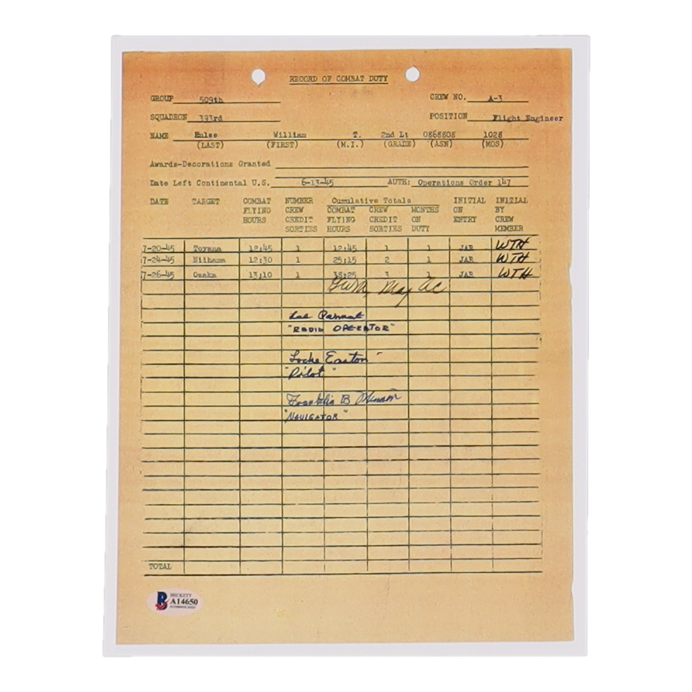 Lee Palmert, Locke Easton & Franklin Wimer Signed World War II 8x10 Document Copy Print with (3) Role Inscriptions (Beckett)