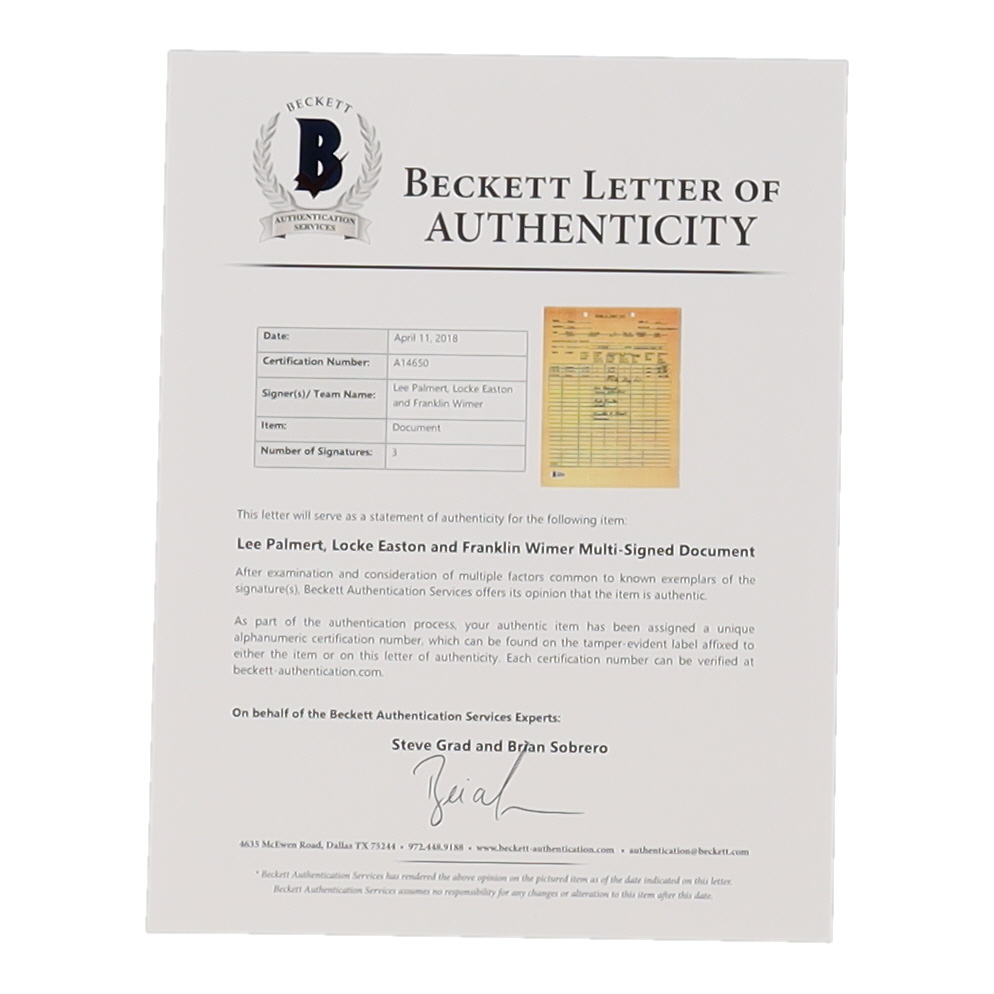 Copy measures 8" x 10" in size. Hand-signed by Lee Palmert, Locke Easton and Franklin Wimer.