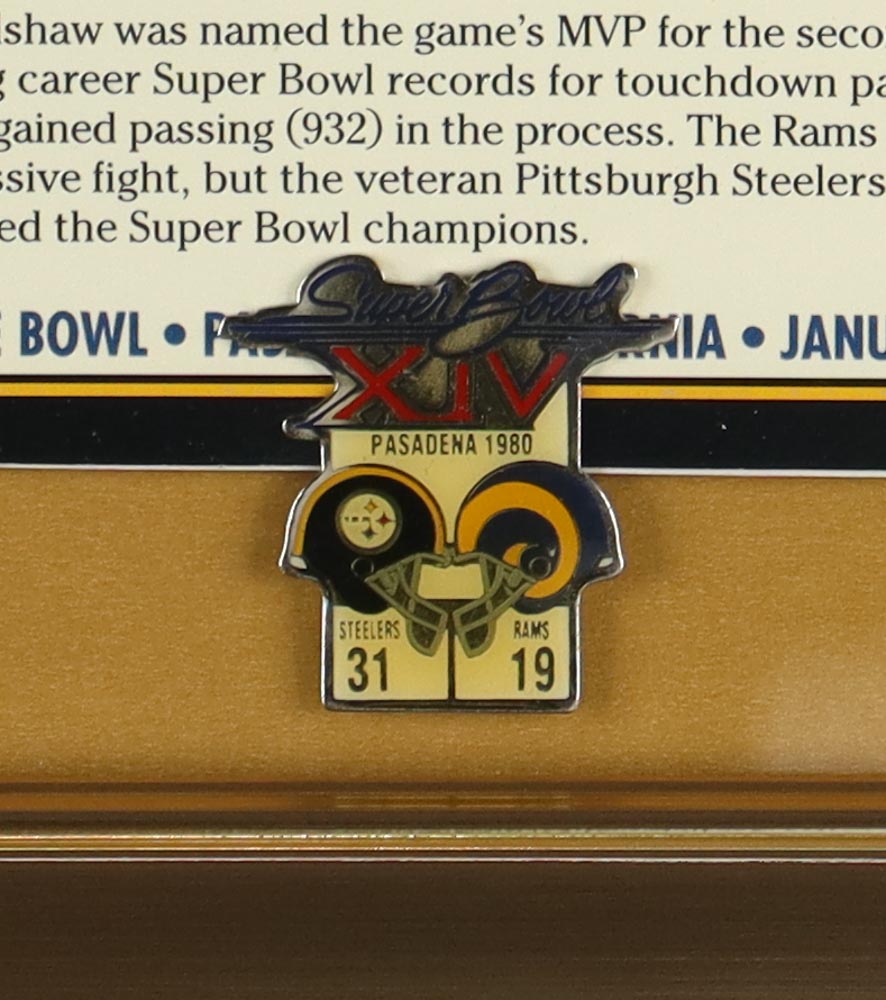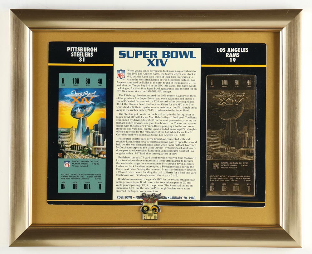 Custom framed display measures 13" x 16" in size and features a Super Bowl XIV 23kt gold ticket and pin.