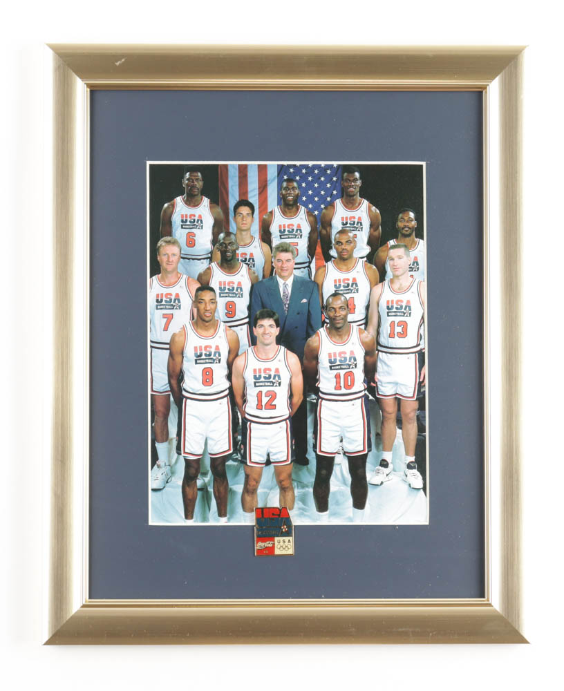Custom frame measures 13" x 16" in size and features a photo of 1992 Team USA Basketball "Dream Team". Display also features an Official Olympic pin. Please note, the display is unsigned.