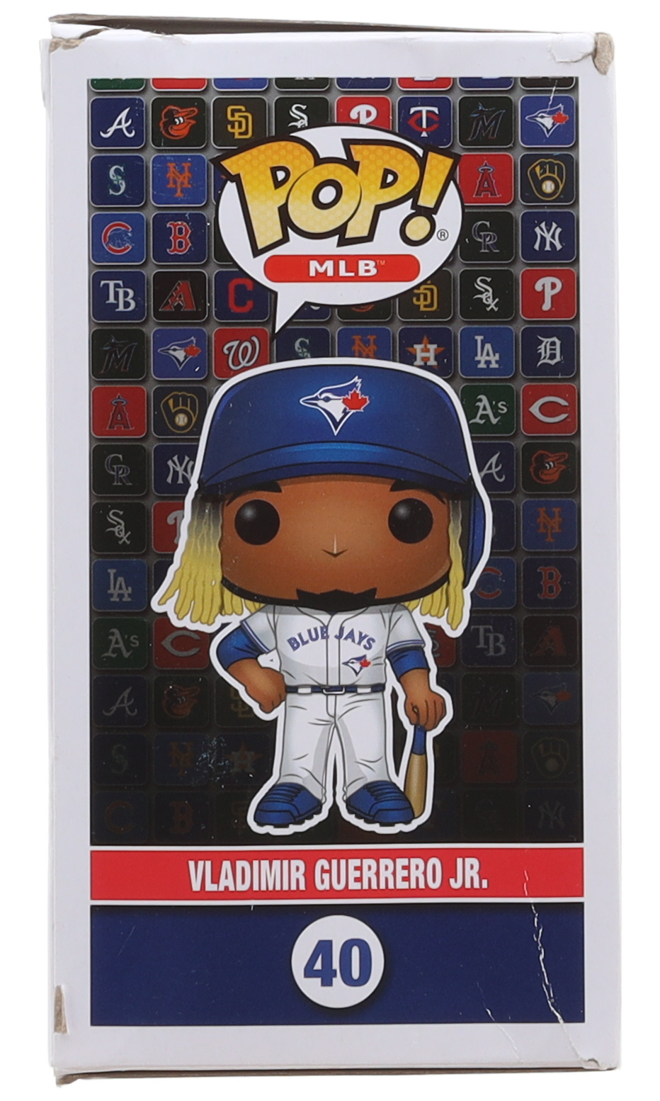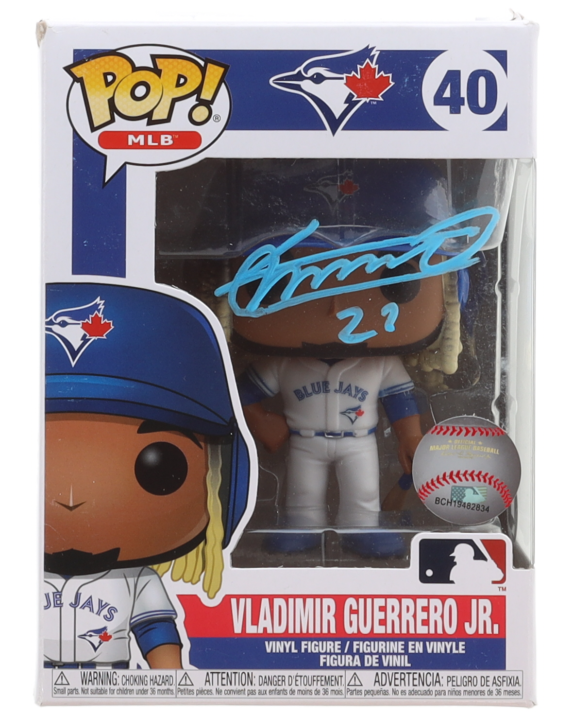 Funko Pop! Vinyl Figure measures approximately 4" tall and has been hand-signed on the packaging by Vladimir Guerrero Jr. (Toronto Blue Jays). Please note, there is creasing and tears on the top panel of the packaging.