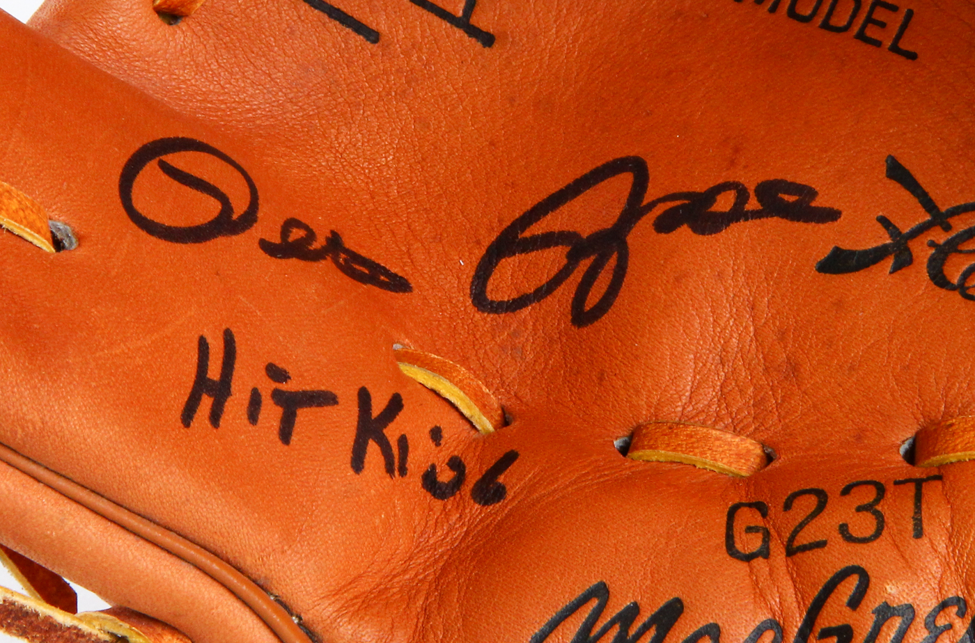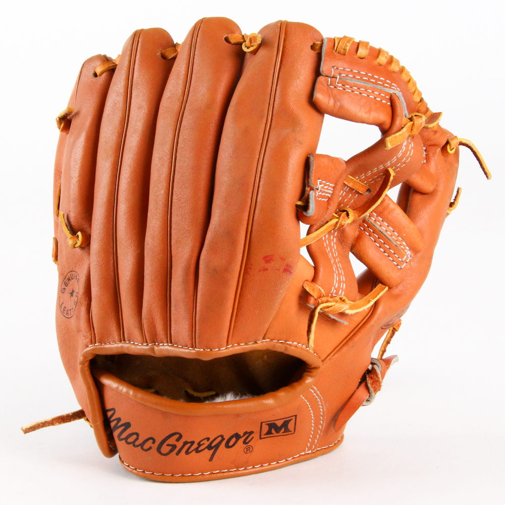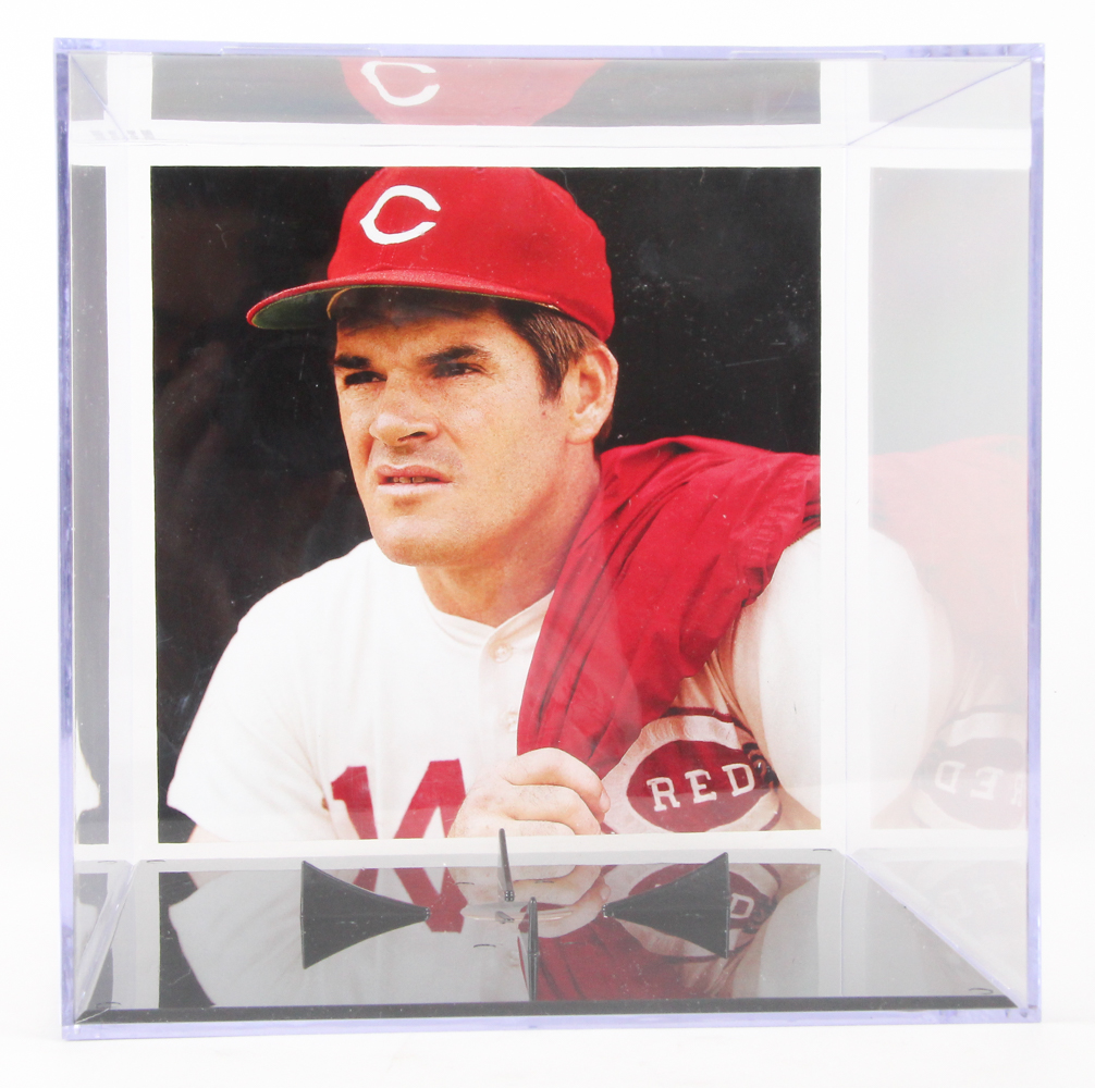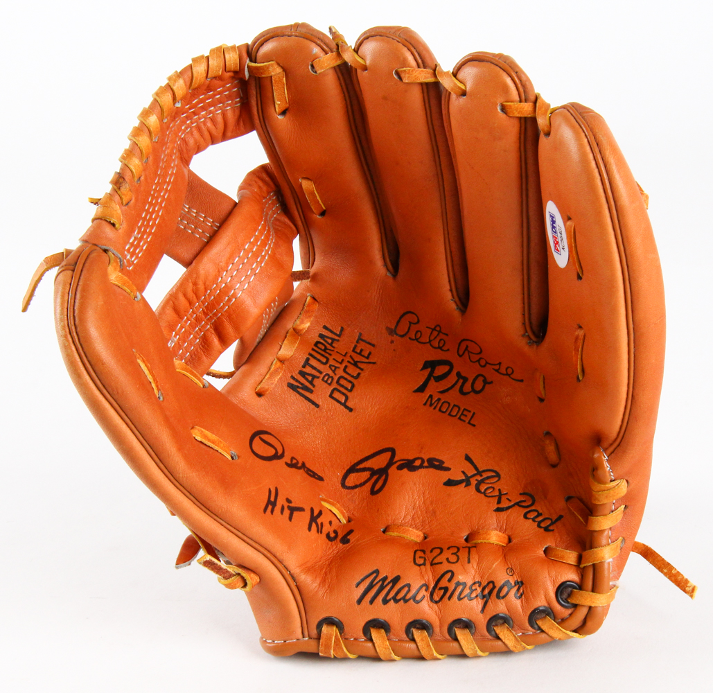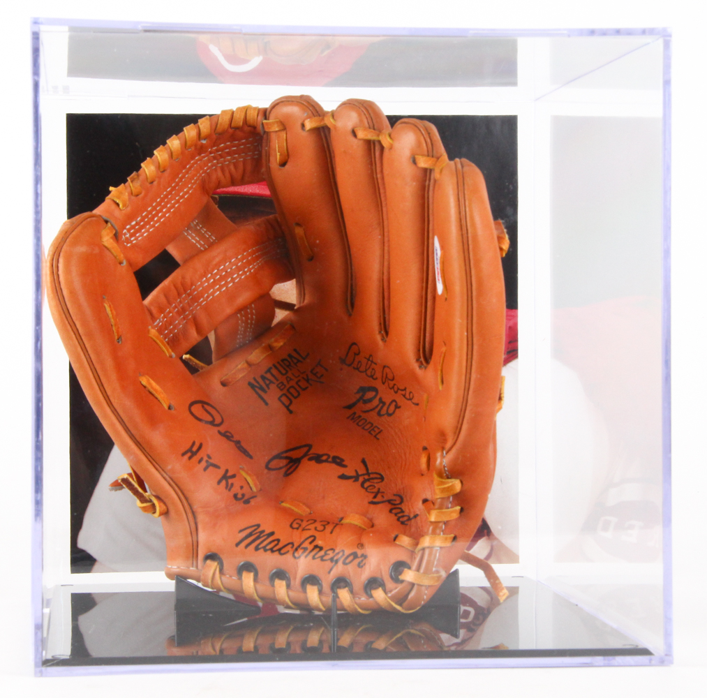 Rawlings "MacGregor" baseball glove. Hand-signed in black felt tip pen by Pete Rose (Reds). The glove includes the display Case shown in photos. Includes a photo of Pete Rose attached to the inside of the case.
