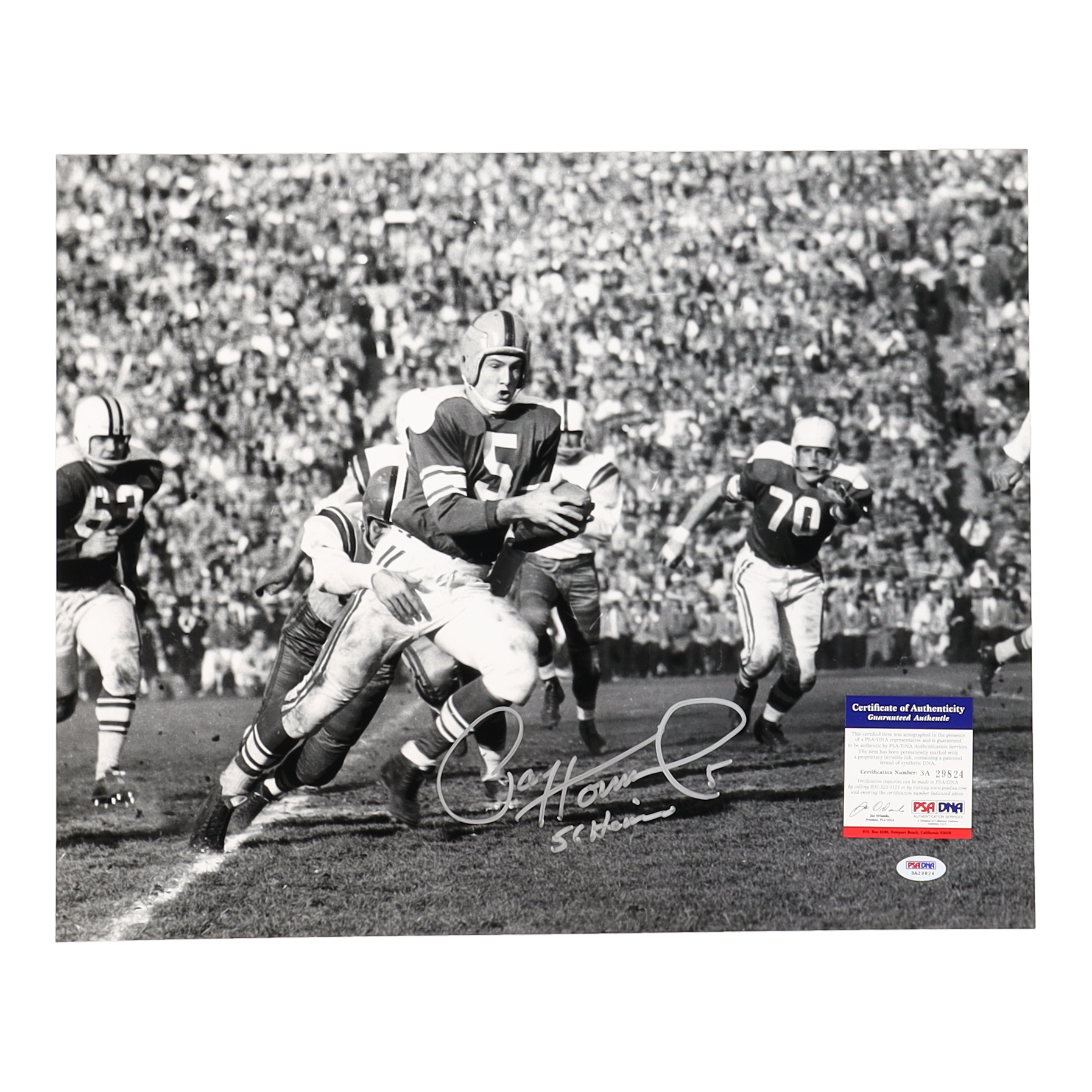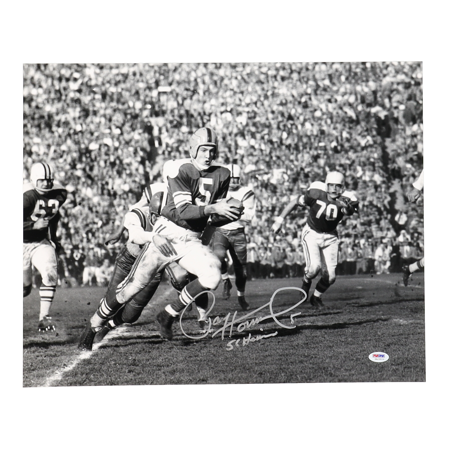 Photo measures 16" x 20" in size. Hand-signed and inscribed by Paul Hornung (D. 2020, Notre Dame Fighting Irish, HOF).
