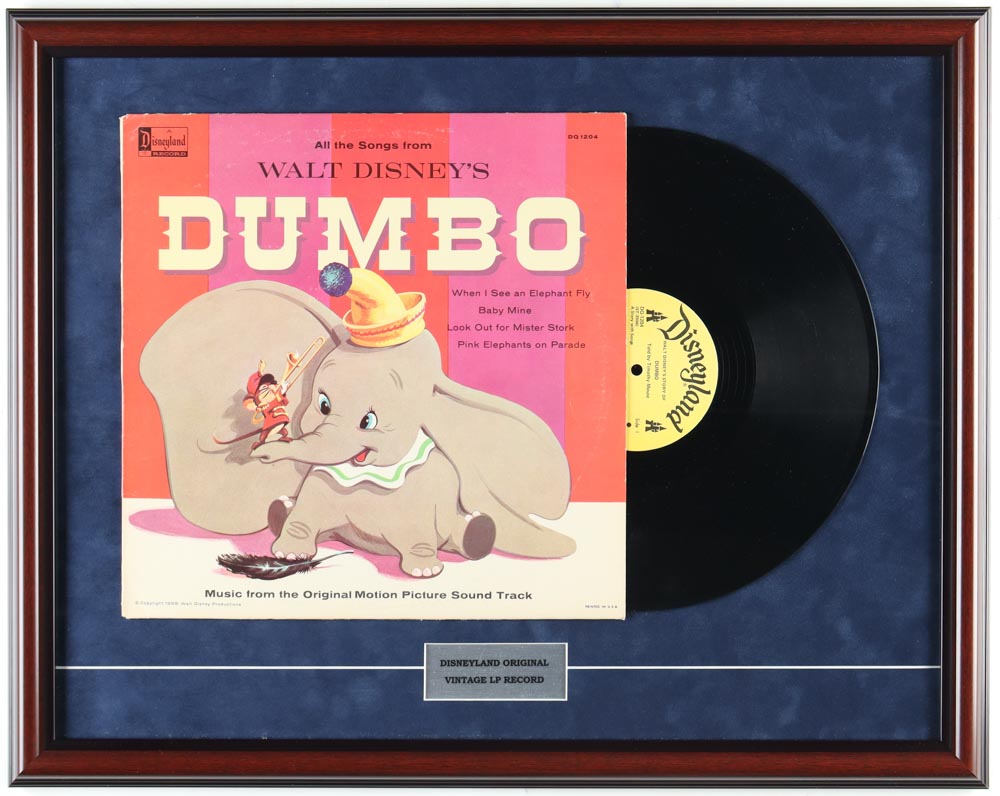 Custom frame measures 19" x 24" in size and features an Original Walt Disney "Dumbo" vinyl record. Please note, the vinyl record is included as shown and the display is not signed.
