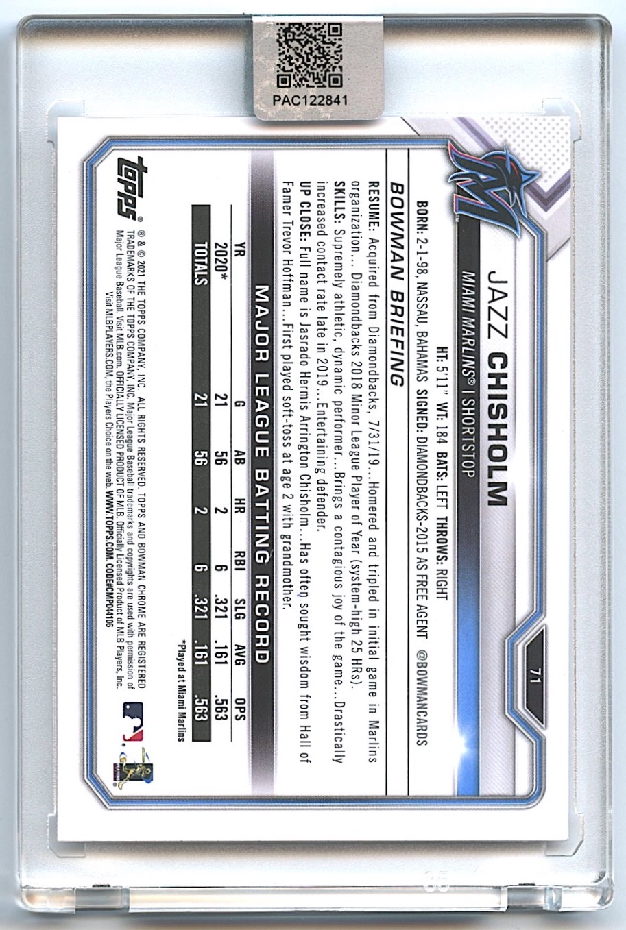 Jazz Chisholm Jr. Signed 2021 Bowman #71 RC (PA Encapsulated)