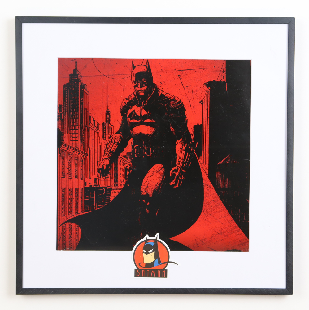 Custom matted frame measures 16" x 16" in size and contains a print from "The Batman" and a 90's Batman Animated Series sticker. Please note, the print is unsigned.