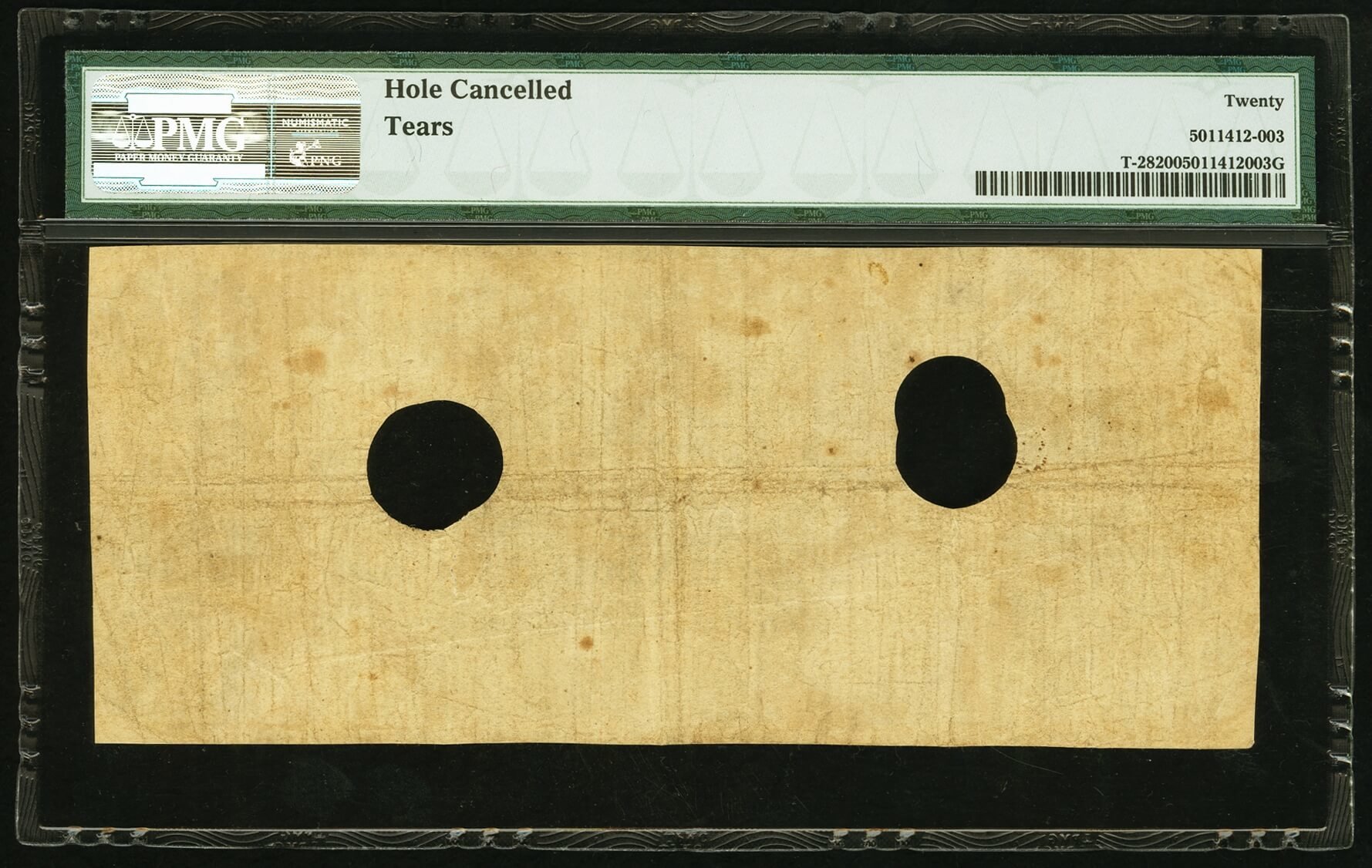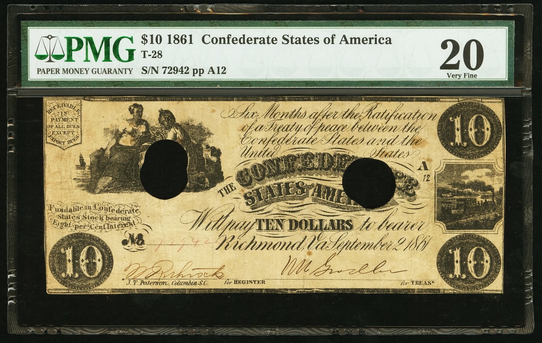 Printed by J.T. Paterson & Co. sometime after May, 1862, when Paterson took over some of Hoyer & Ludwig's printing contracts, this bill is graded 20 (Very Fine) by PMG. PMB notes hole cancels as well as tears which are not readily seen through the holder.