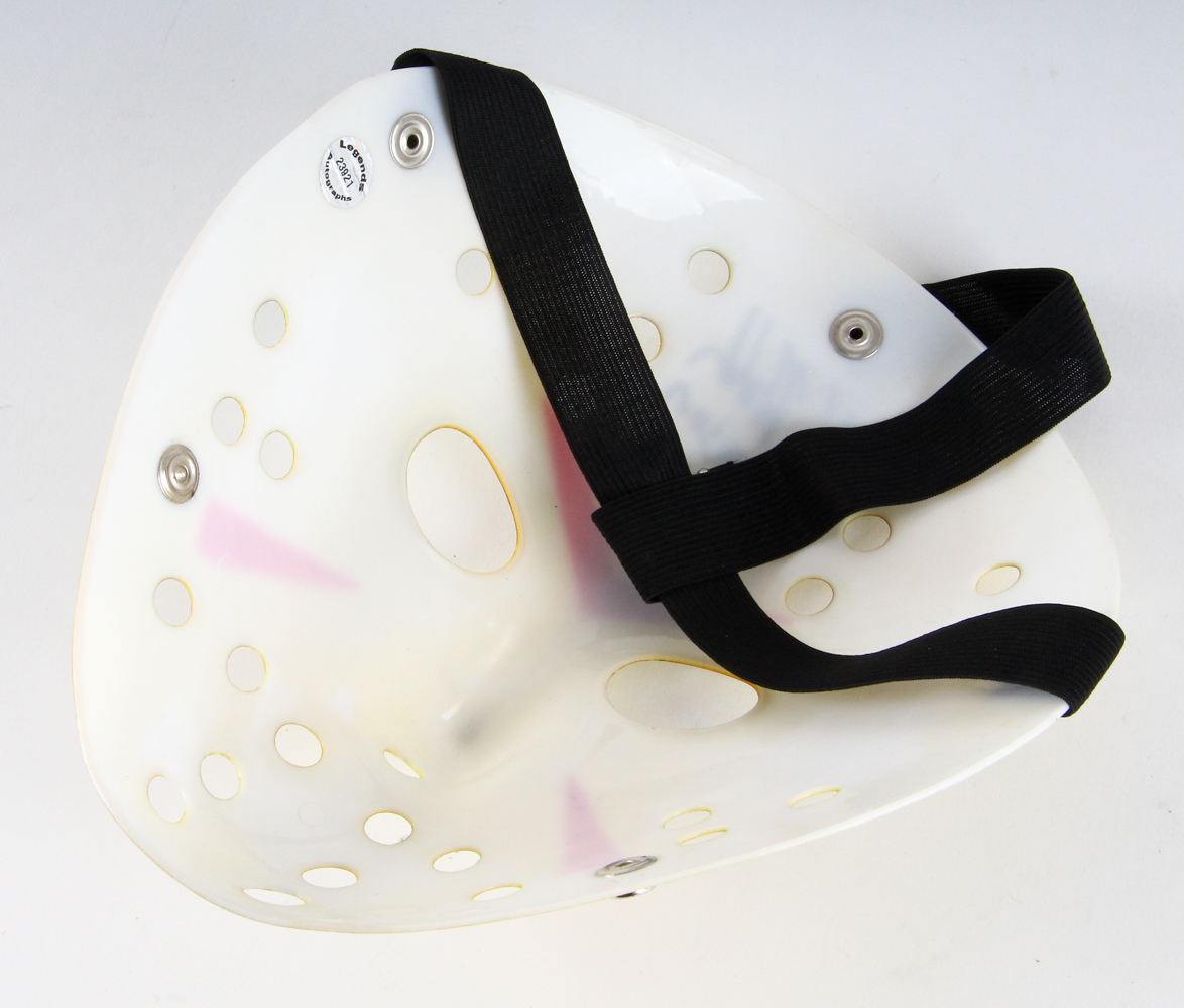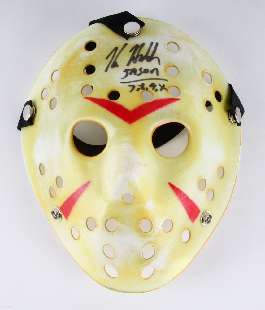 This is a custom replica "Jason" mask. Hand-signed and inscribed in black felt-tip pen by Kane Hodder (Jason).
