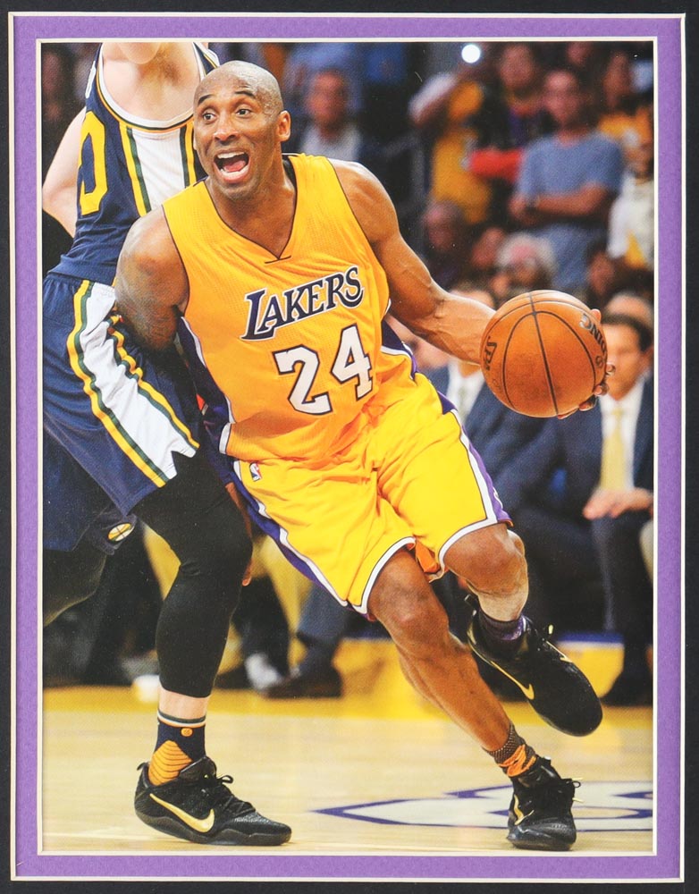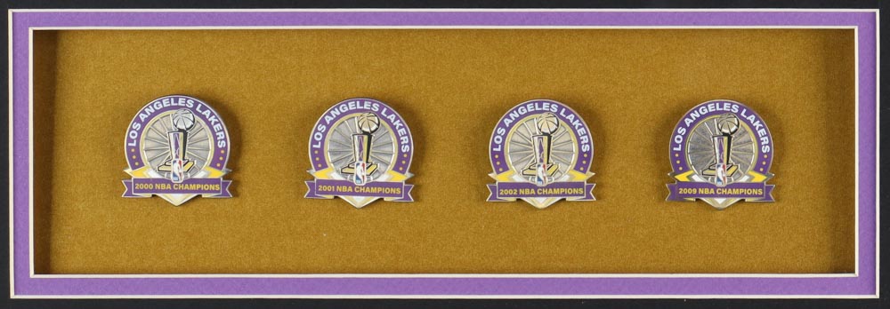 Custom frame measures 32" x 36" in size and features an unsigned Kobe Bryant (D. 2020, HOF) jersey as well as (4) Championship pins. Please see photos for details regarding the condition of the frame. Please note, the display is unsigned.