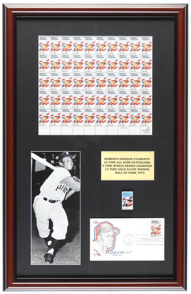 Roberto Clemente Custom Framed Uncut Postage Stamp Sheet Display With (50) Stamps With Photo, Pin & First Day Issue Envelope