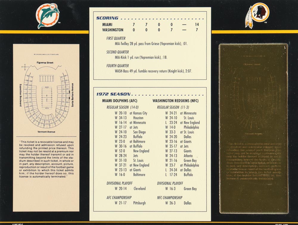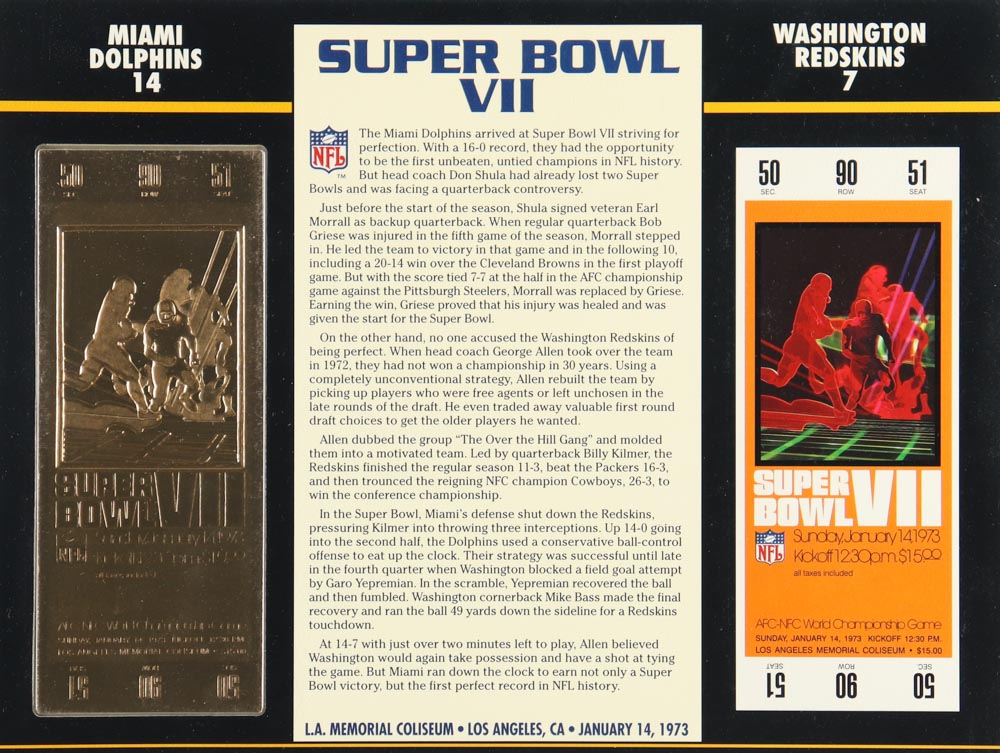 Card measures approximately 9" x 12" in size. Features game stats on the reverse side and a Super Bowl VII replica gold ticket.