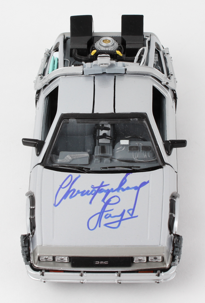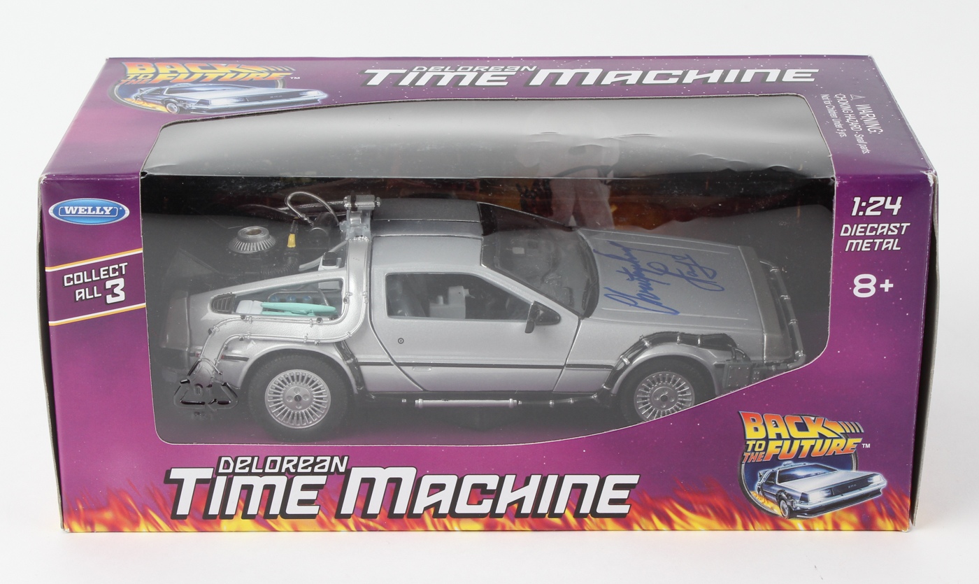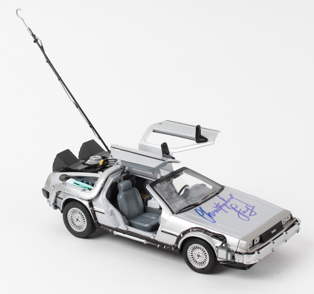 DeLorean Time Machine 1:24 Scale Diecast Model Car. Hand-signed in blue felt-tip pen by Christopher Lloyd (Dr. Emmett Brown).
