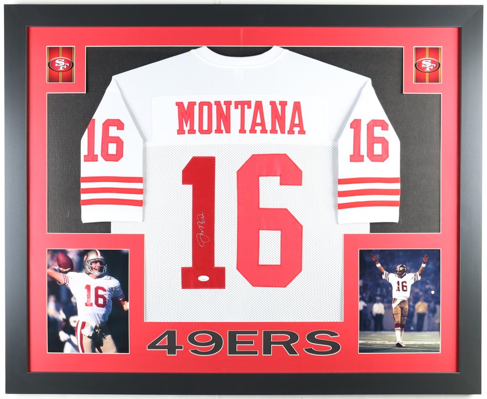 Custom frame measures 35" x 43" in size and features a jersey hand-signed by Joe Montana (HOF). Please note that the 8" x 10" photos may be in different order.