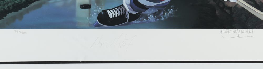 Custom framed display measures 25" x 33" in size and features a lithograph that has been hand-signed by Wayne Gretzky (Edmonton Oilers, HOF). The lithograph has also been signed by the artist, Danny Day, and numbered #740/880.
