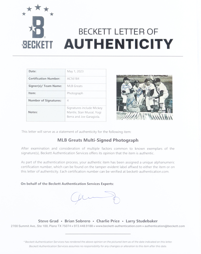 Photo measures 8" x 10" in size and has been hand-signed by Stan Musial (D. 2013, St. Louis Cardinals, HOF), Mickey Mantle (D. 1995, New York Yankees, HOF), Yogi Berra (D. 2015, New York Yankees, HOF) and Joe Garagiola (D. 2016, St. Louis Cardinals).