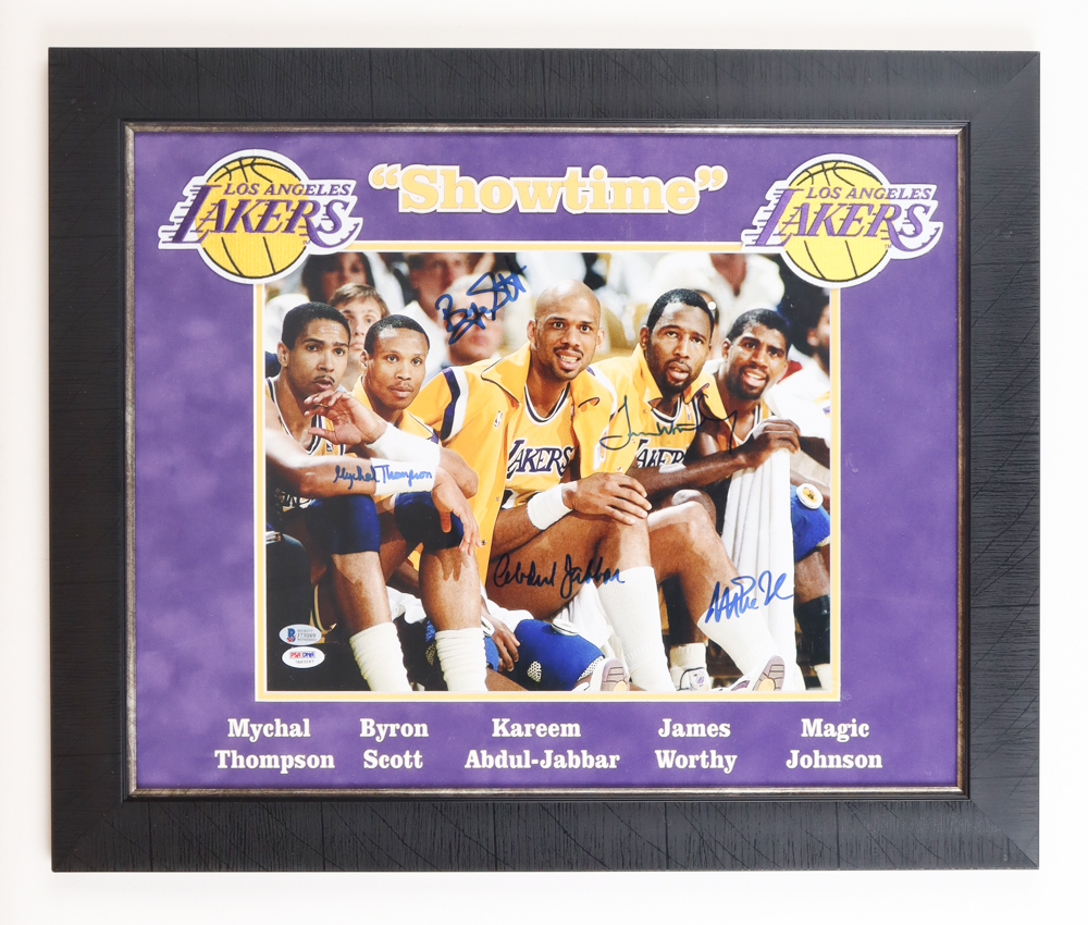 "Showtime" Lakers Custom Framed Photo Display Signed by (5) with Kareem Abdul-Jabbar, James Worthy, Magic Johnson with (2) Lakers Patches (PSA & Beckett)