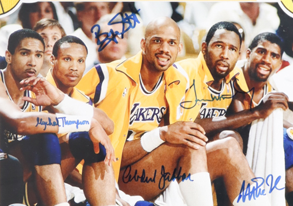 Custom frame measures 20" x 24" in size and features a photo that has been hand-signed by Kareem Abdul-Jabbar (HOF), James Worthy (HOF), Magic Johnson (HOF), Mychal Thompson and Byron Scott. Display also features (2) Los Angeles Lakers Patches.