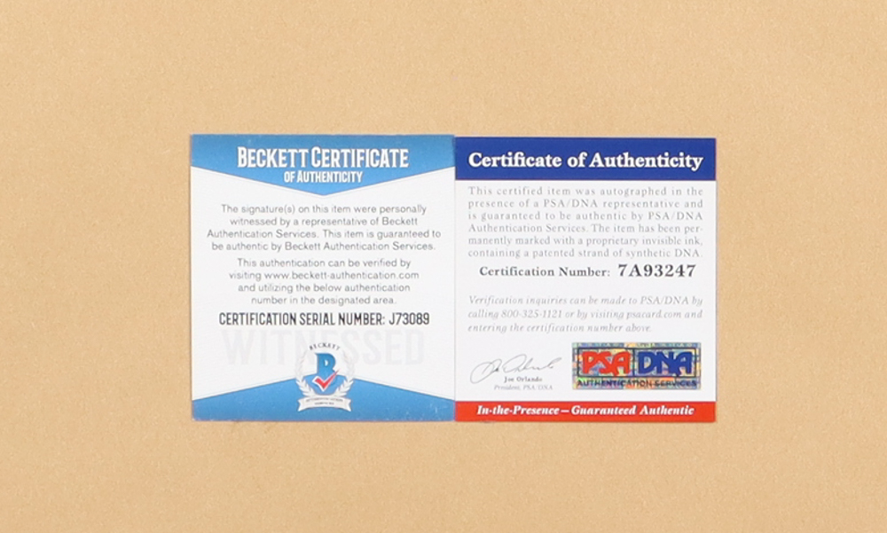 The autograph(s) includes an official PSA/DNA hologram and matching COA as well as an official Beckett Authentication Services serially-numbered hologram and matching COA for authenticity purposes. The signing of this item was witnessed by PSA and Beckett.