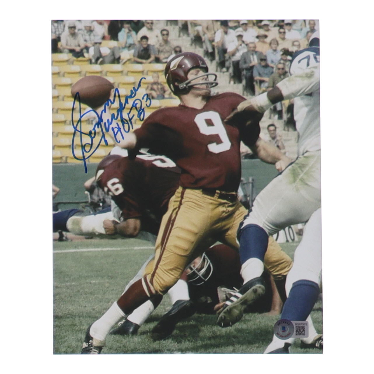 Photo measures 8" x 10" in size and has been hand-signed and inscribed by Sonny Jurgensen (Washington Redskins, HOF).