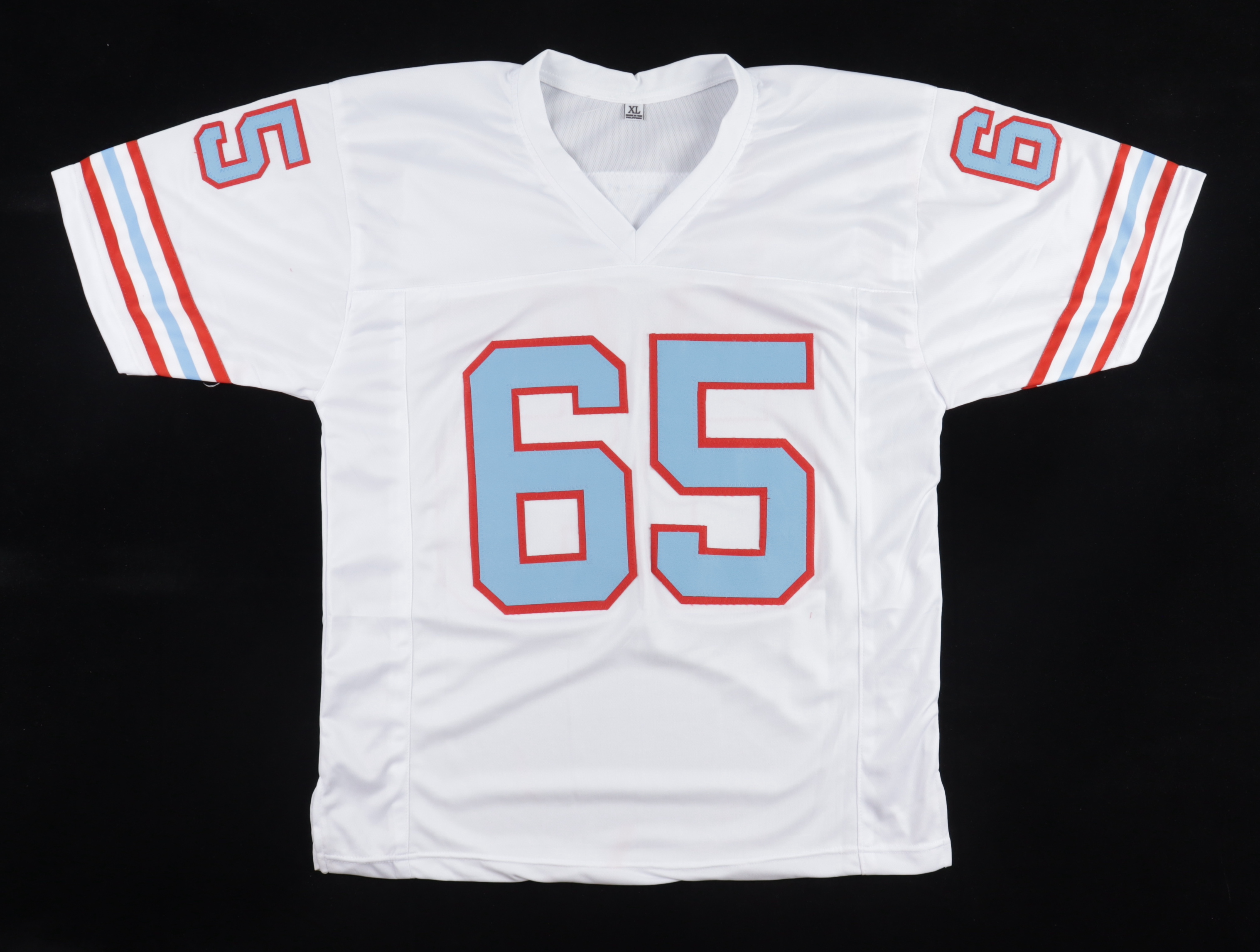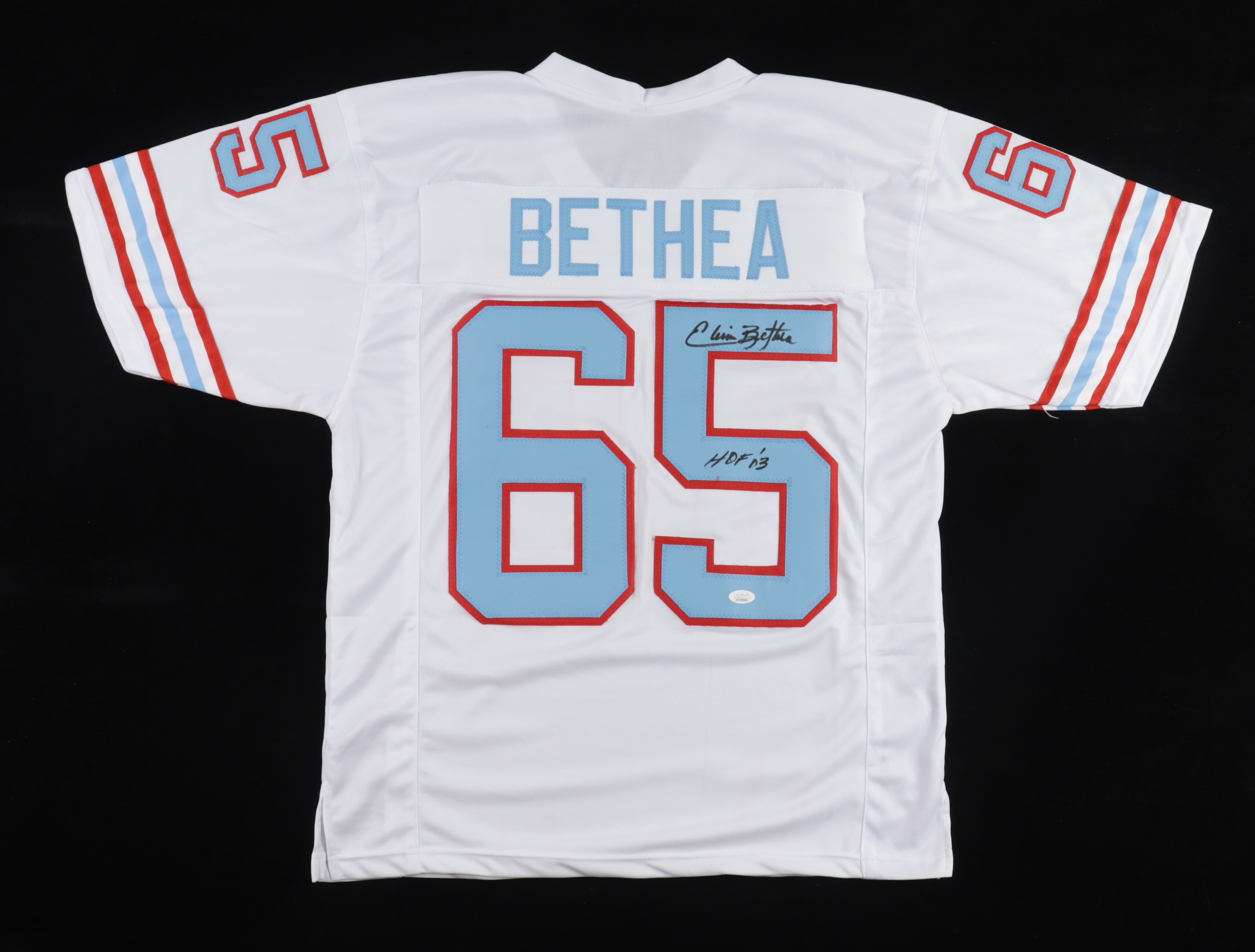 Custom jersey. Everything sewn on, size XL. Hand-signed and inscribed by Elvin Bethea (HOF).