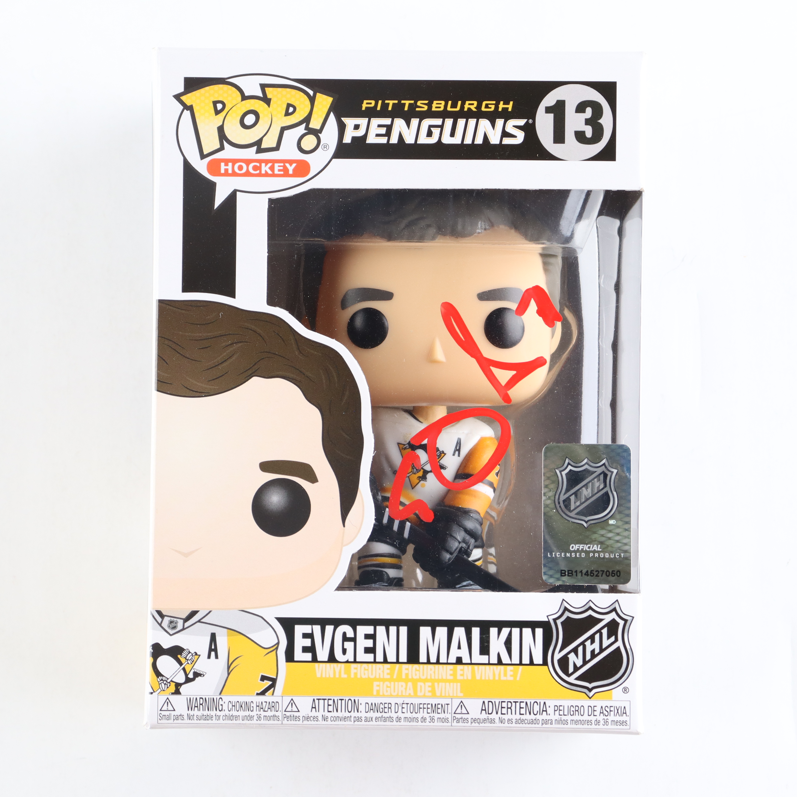 Funko Pop! figure measures approximately 4" tall and the packaging has been hand-signed by Evgeni Malkin (Pittsburgh Penguins).