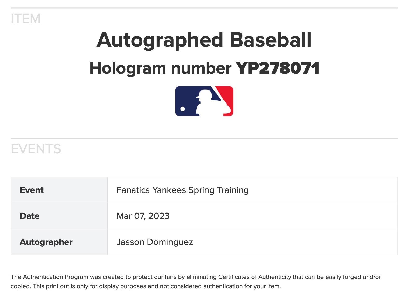 Authentication: MLB Hologram & Fanatics Hologram