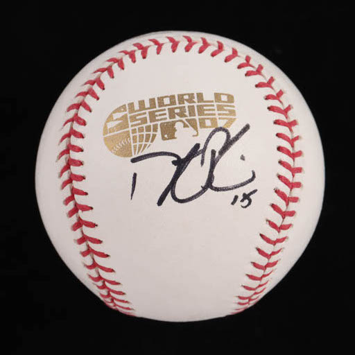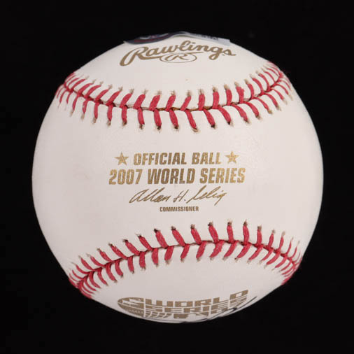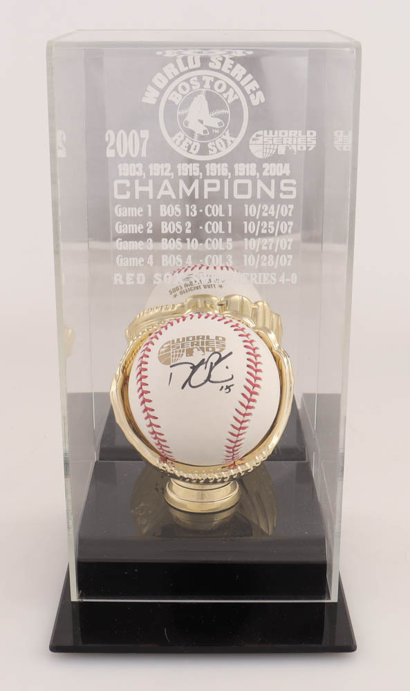 Rawlings Official 2007 World Series baseball has been hand-signed by Dustin Pedroia (Boston Red Sox). Display case is included, as shown.