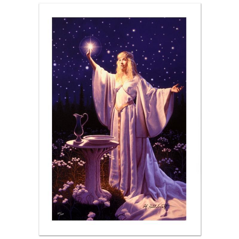 Known world wide for his fantasy and science fiction illustrations, Greg Hildebrandt has created an abundance of fascinating artwork including, and most notably his illustration work for J.R.R. Tolkien's 'The Hobbit' and 'Lord of the Rings'. "The Ring Of Galadriel", originally created in the 1970's for Ballantine Books, is a limited edition giclee on canvas, numbered and hand-signed by Greg Hildebrandt! Measures approx. Measures approx. 20" x 30" (image).