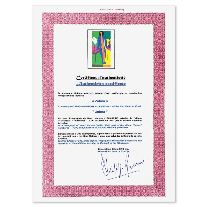 "Zulma" is a limited edition lithograph by Henri Matisse (1869-1954) bearing the plate signature of the artist. This piece comes from an edition of 200 authorized by the Matisse Estate; the edition number is not on the piece itself but on the certificate. Includes Certificate of Authenticity. Measures approx. 25" x 35.5" (image).