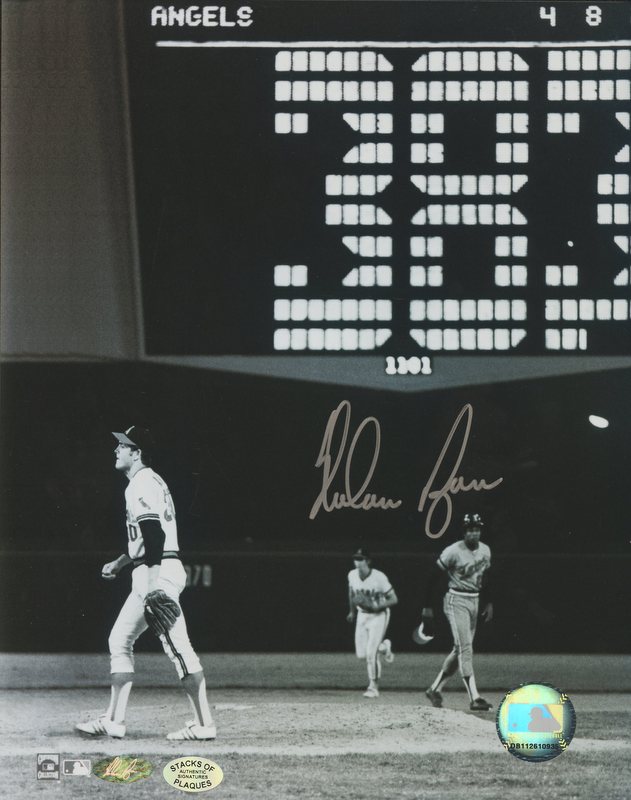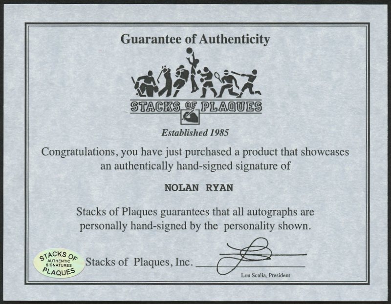 The autograph includes an official Stacks and Plaques hologram and matching COA for authenticity purposes. Also includes a official Nolan Ryan hologram.