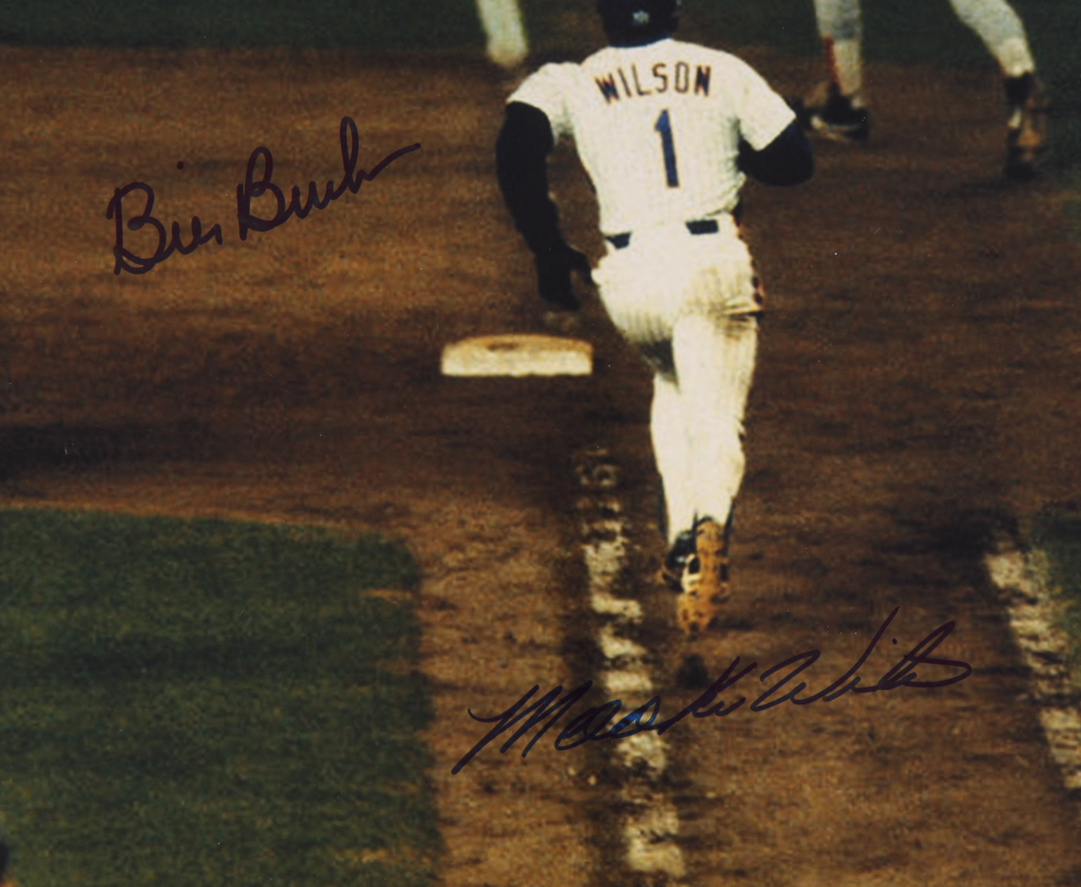 Photo measures 16" x 20" in size. Hand-signed in blue and black felt-tip pen by Mookie Wilson (Mets) and Bill Buckner (Dodgers).