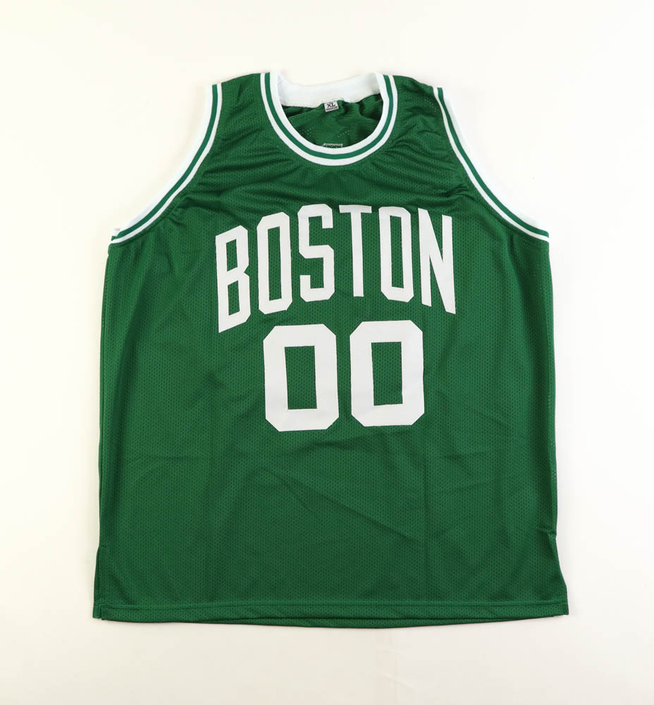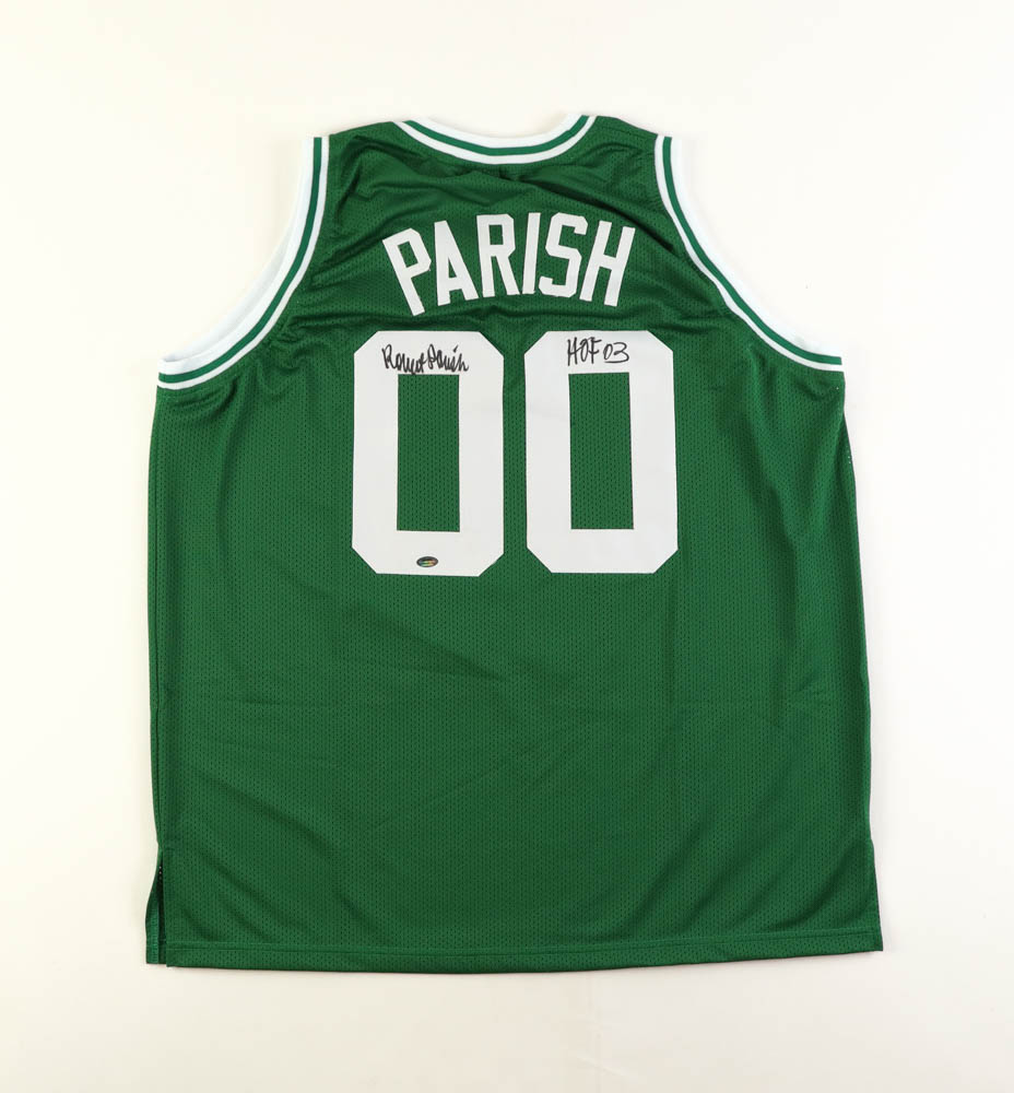 Custom jersey. Everything sewn on, size XL. Hand-signed and inscribed by Robert Parish (HOF).