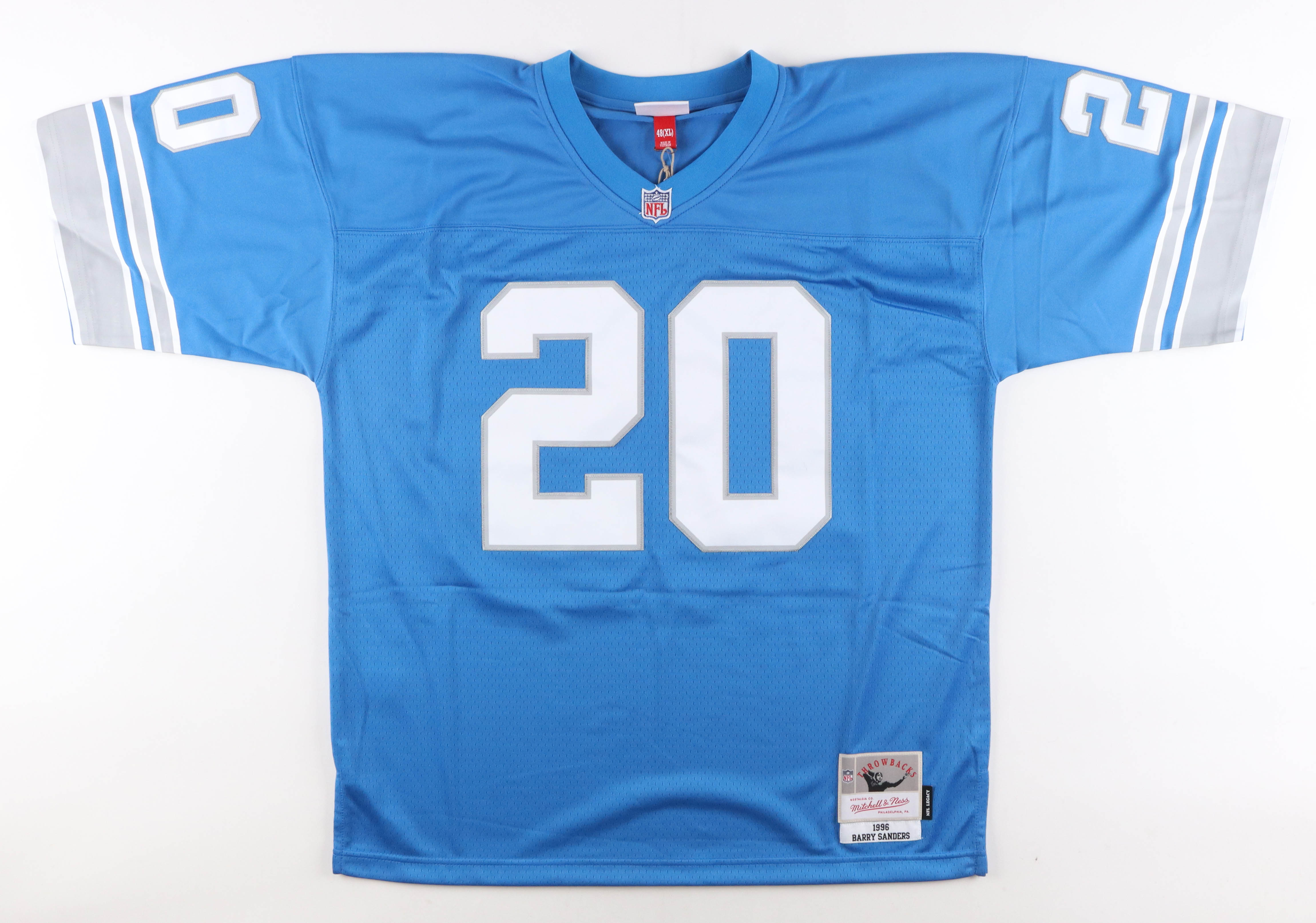 Mitchell & Ness jersey. Everything is printed on, size 48. Hand-signed by Barry Sanders (Detroit Lions, HOF).