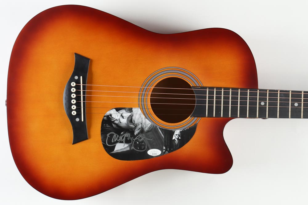 Acoustic guitar measures approximately 38" in length and has been hand-signed on a CD cover that has been repurposed as a pick-guard by Jon Bon Jovi.