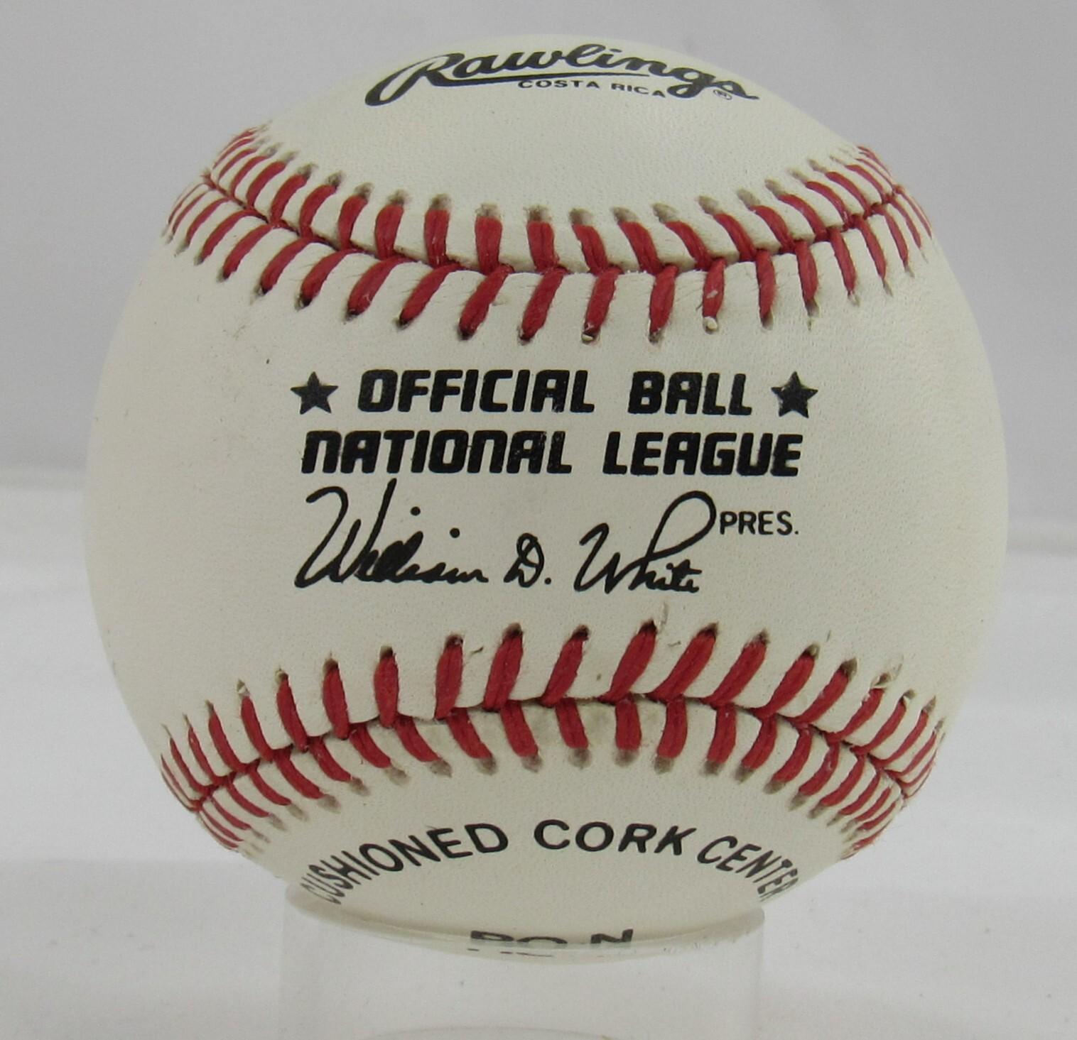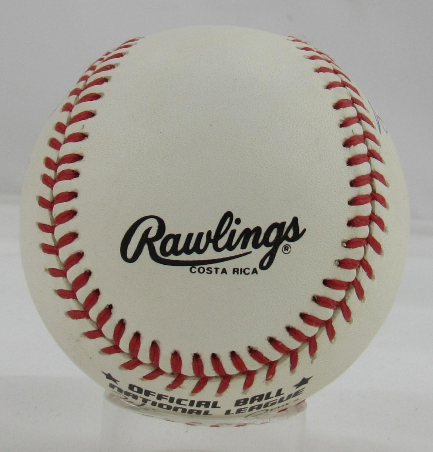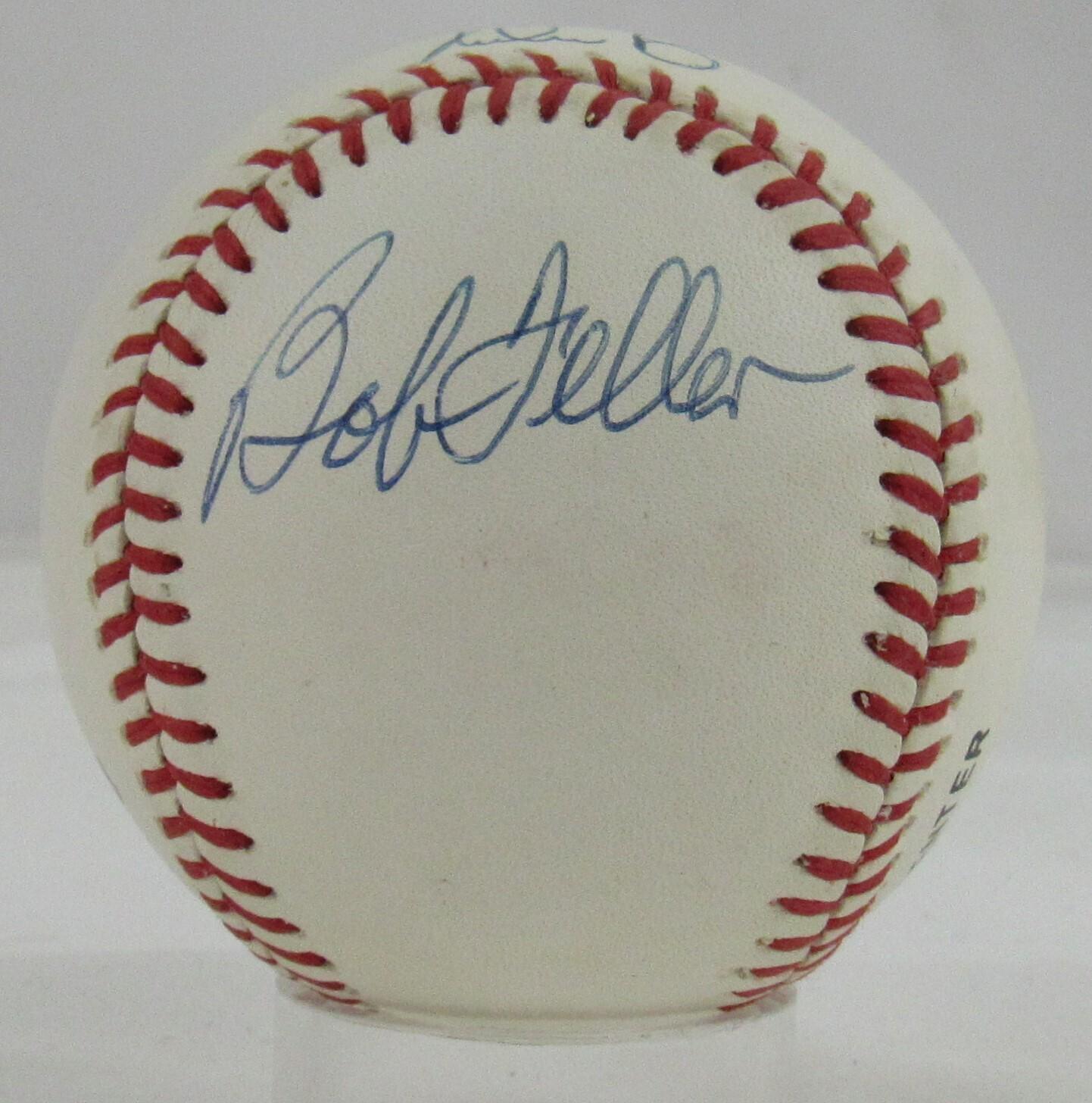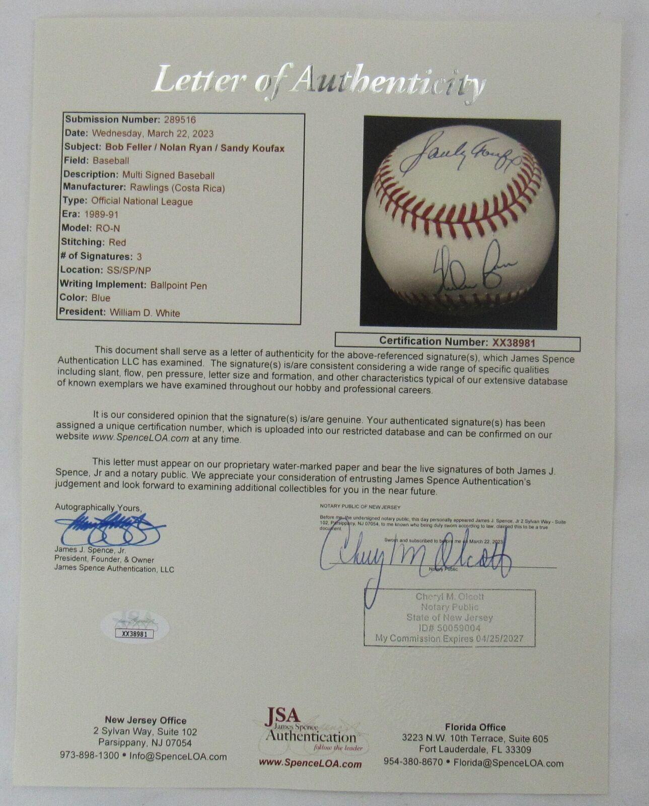 Rawlings official national league baseball. Hand signed by Sandy Koufax (Los Angeles Dodgers, HOF), Nolan Ryan (Houston Astros, HOF) and Bob Feller (D. 2010, Cleveland Indians, HOF).