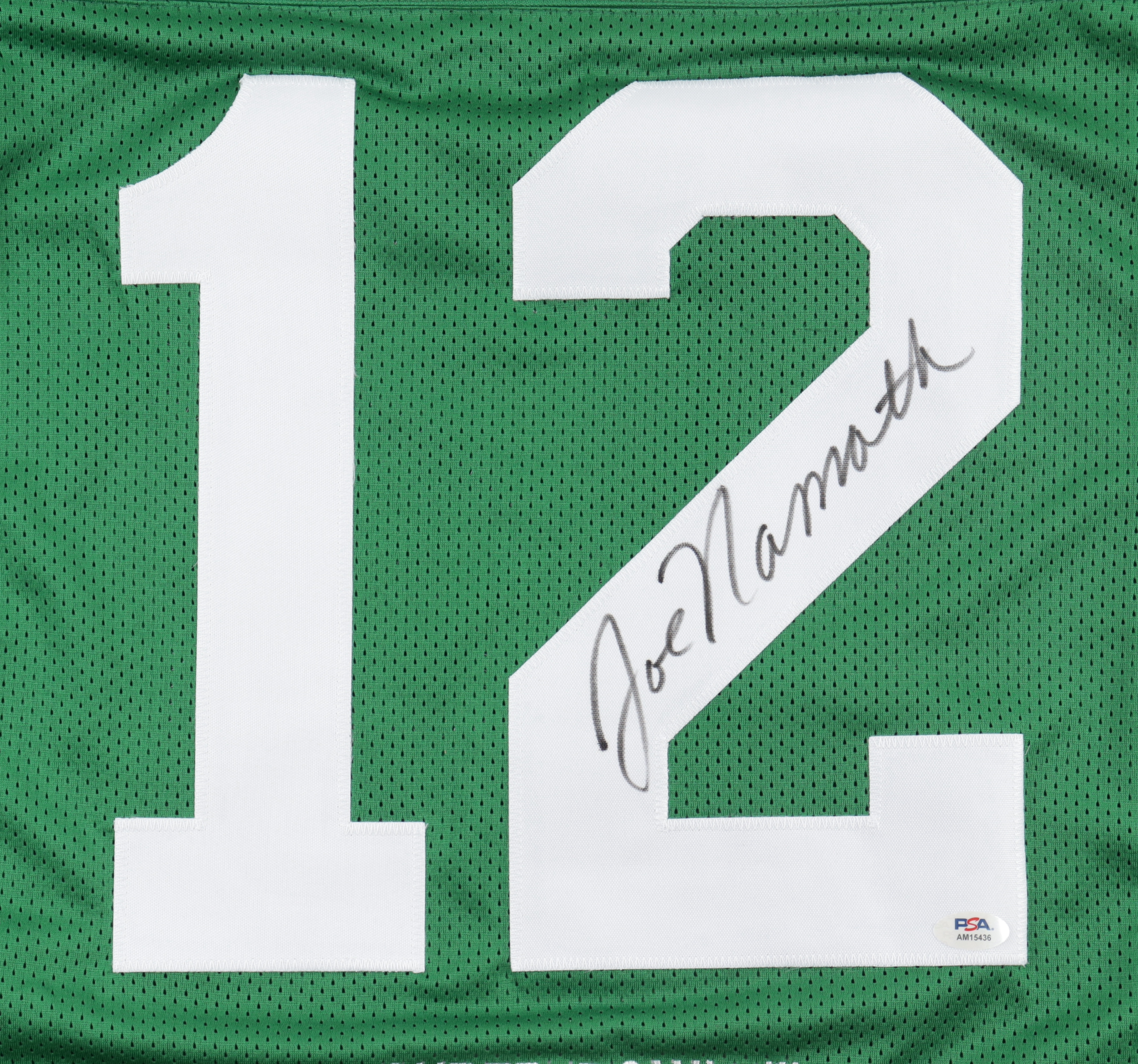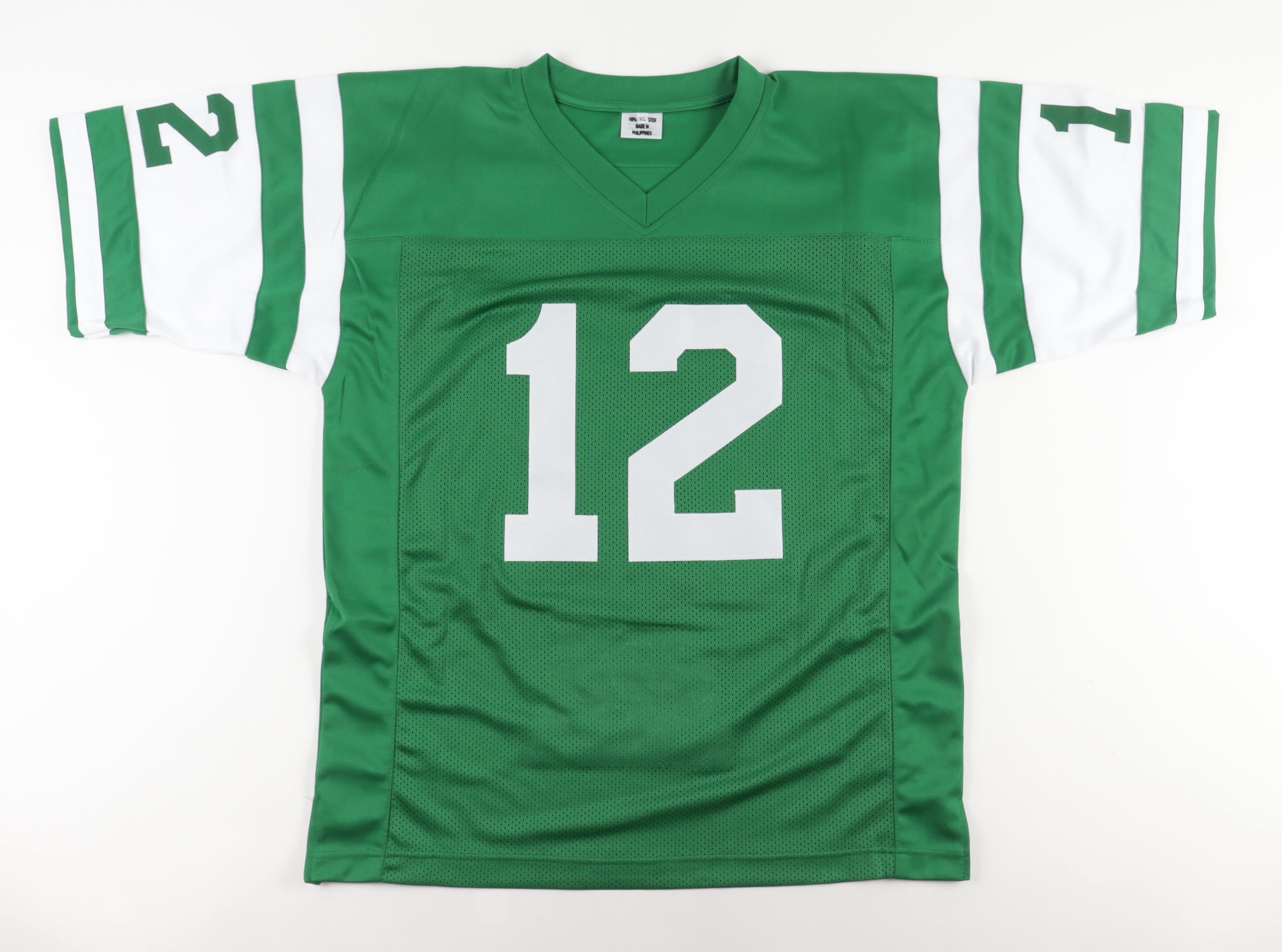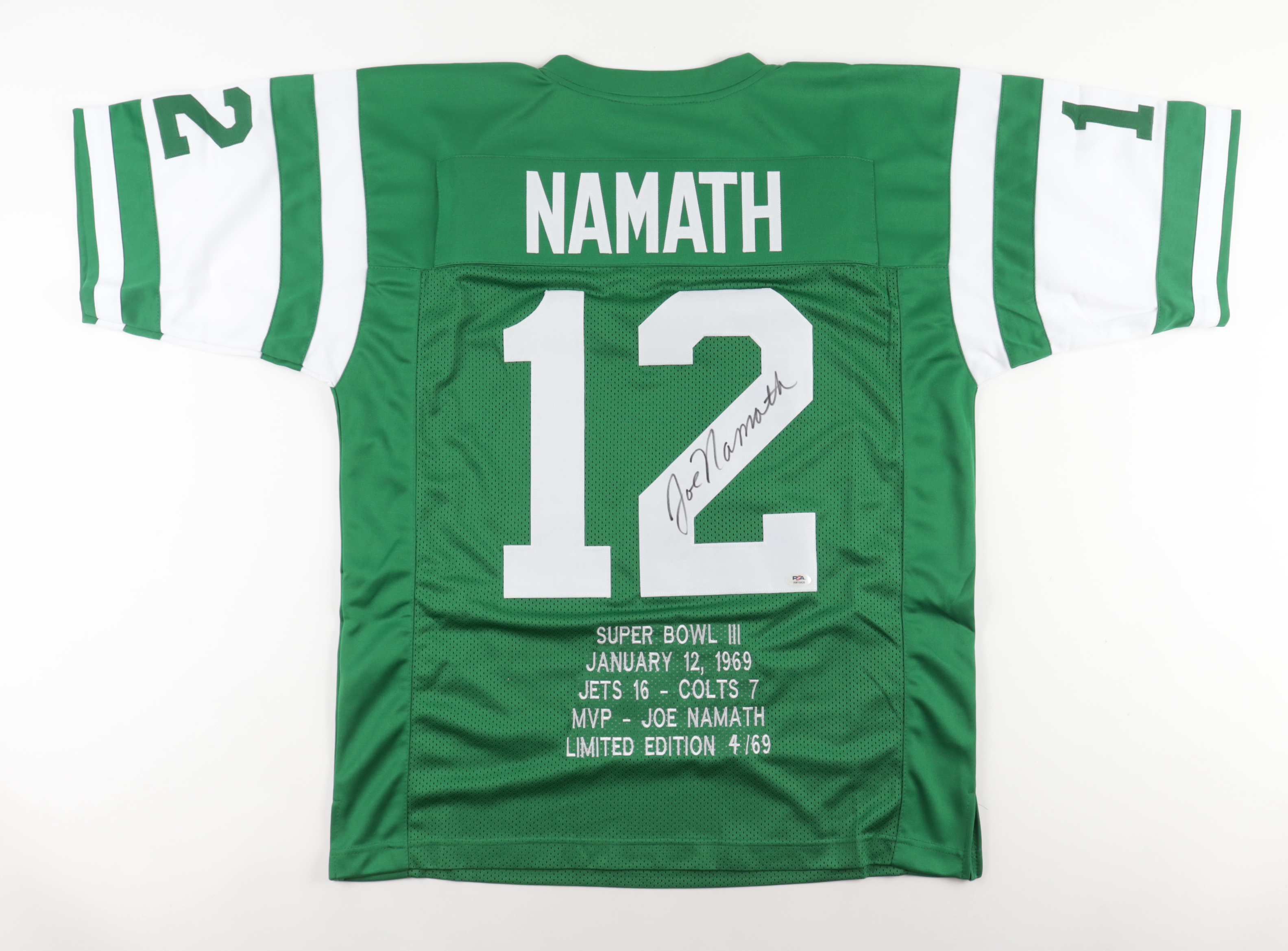 Custom jersey everything is sewn on, size XL. Hand-signed by Joe Namath (HOF). Namath's career stats have been custom stitched onto the back of the jersey below the reverse numbers.