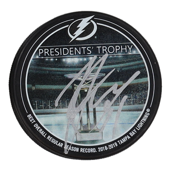 Tampa Bay Lightning Presidents' Trophy logo hockey puck. Has been hand-signed by Steven Stamkos.