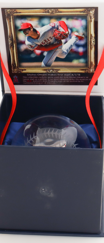 This crystal baseball display commemorates Shohei Ohtani's MLB Debut with the Los Angeles Angels. This ball includes game-used dirt from this historic event. Each crystal ball comes filled with actual game-used dirt from the stadium and shipped in a Fanatics Authentic gift box. It is officially licensed by Major League Baseball (MLB.)