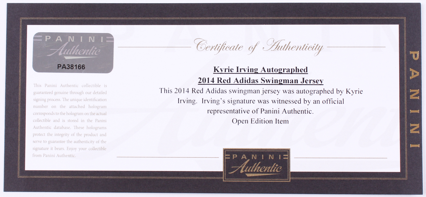 Adidas Swingman on-court style jersey. Everything silk-screened on, size XL (Length +2). Hand-signed in black felt-tip pen by Kyrie Irving.