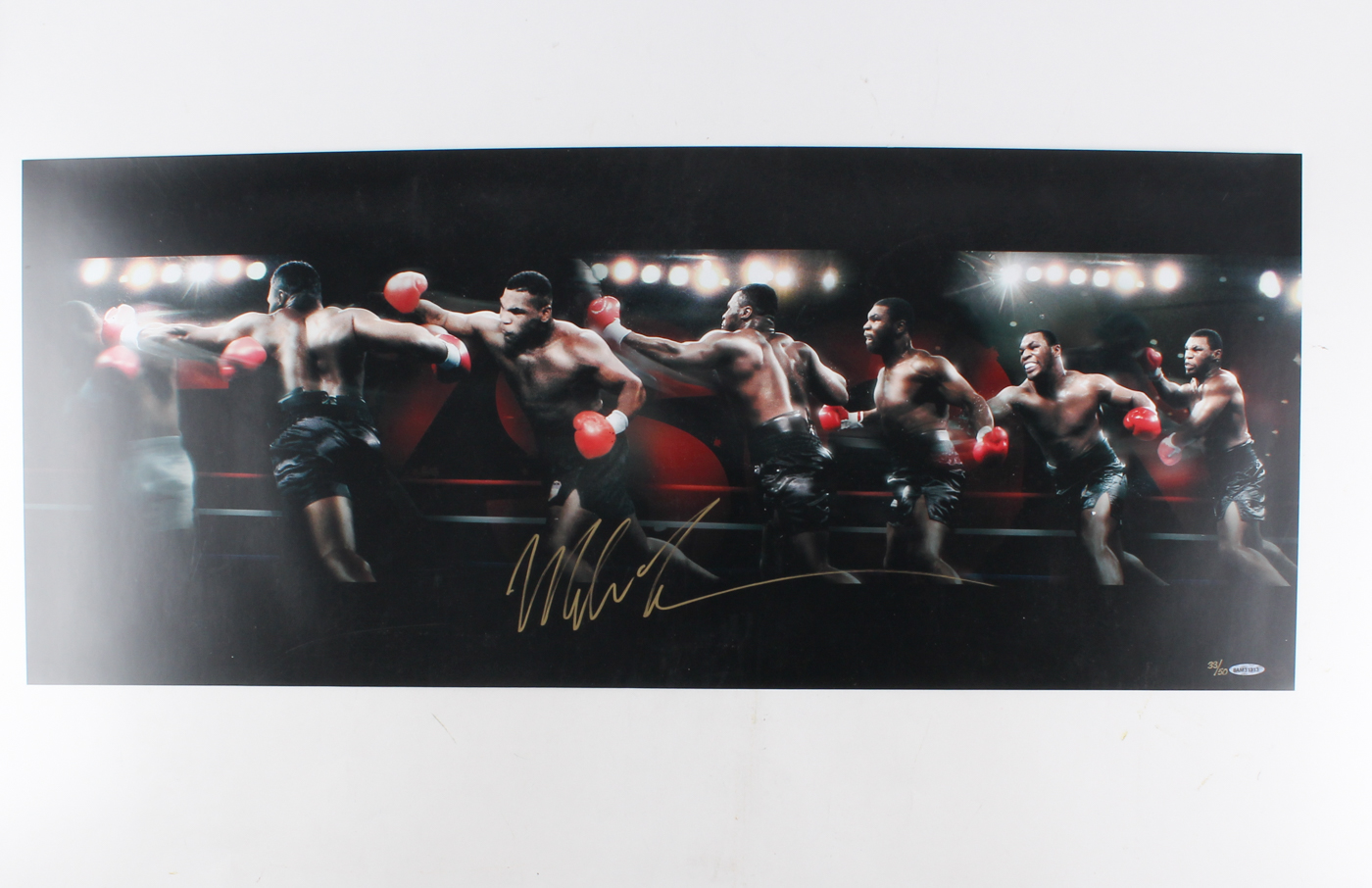 Photo measures 15" x 36" in size and is hand-signed in gold paint pen by Mike Tyson (HOF). Photo is limited edition and has been hand-numbered #33/50.