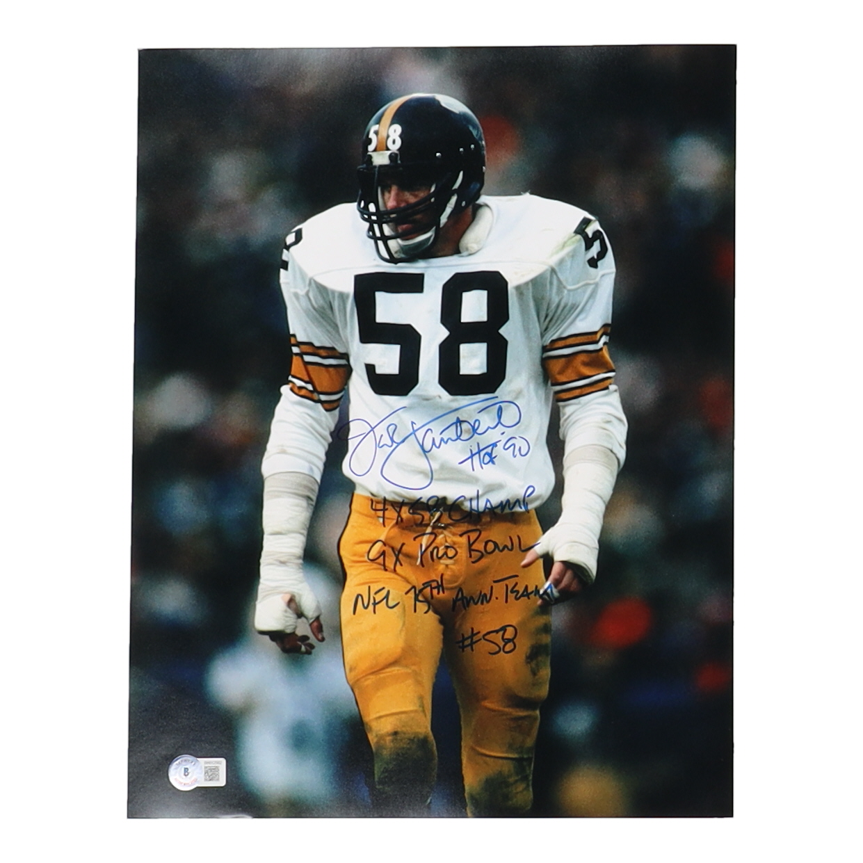 Photo measures 11" x 14" in size and has been hand-signed and inscribed by Jack Lambert (Pittsburgh Steelers, HOF).