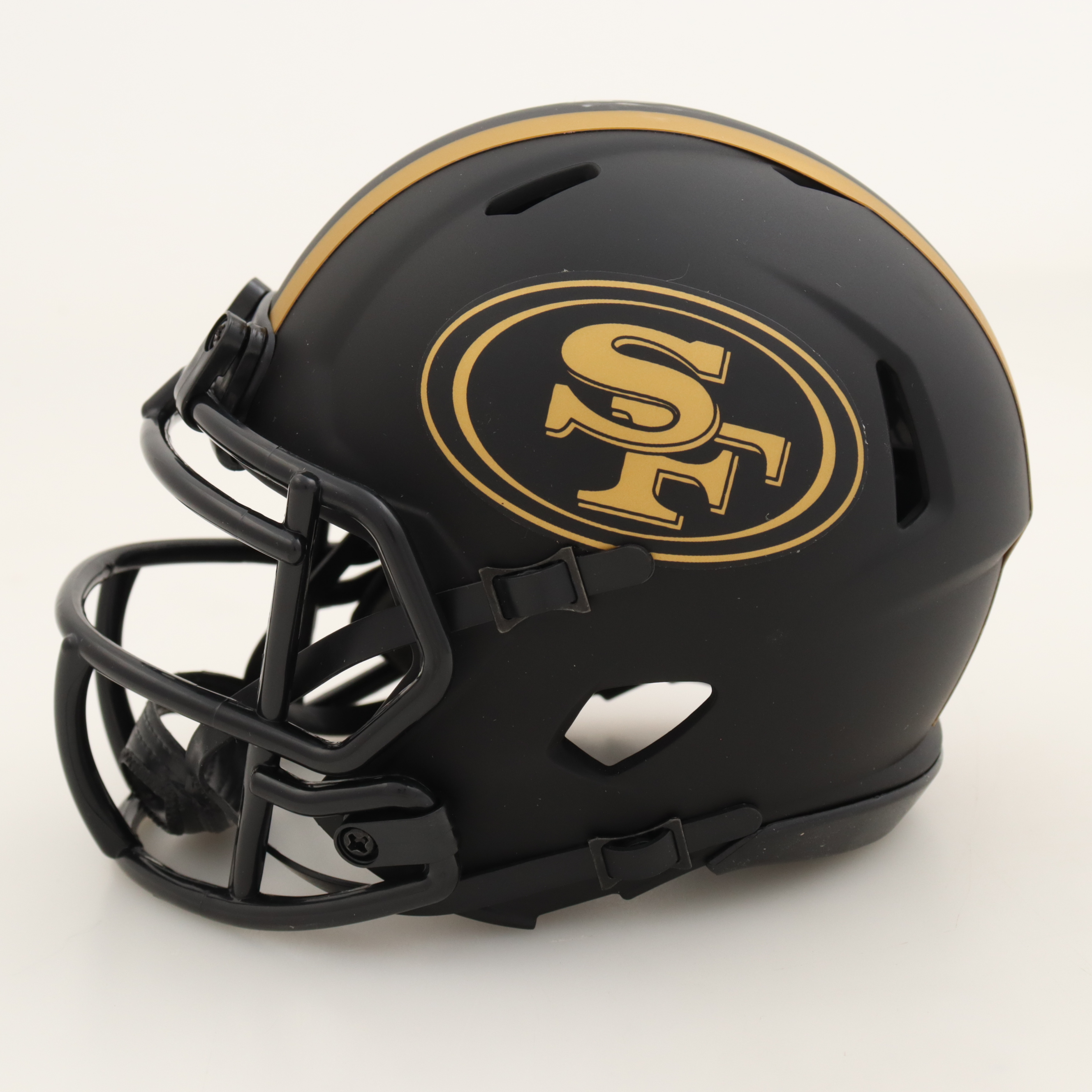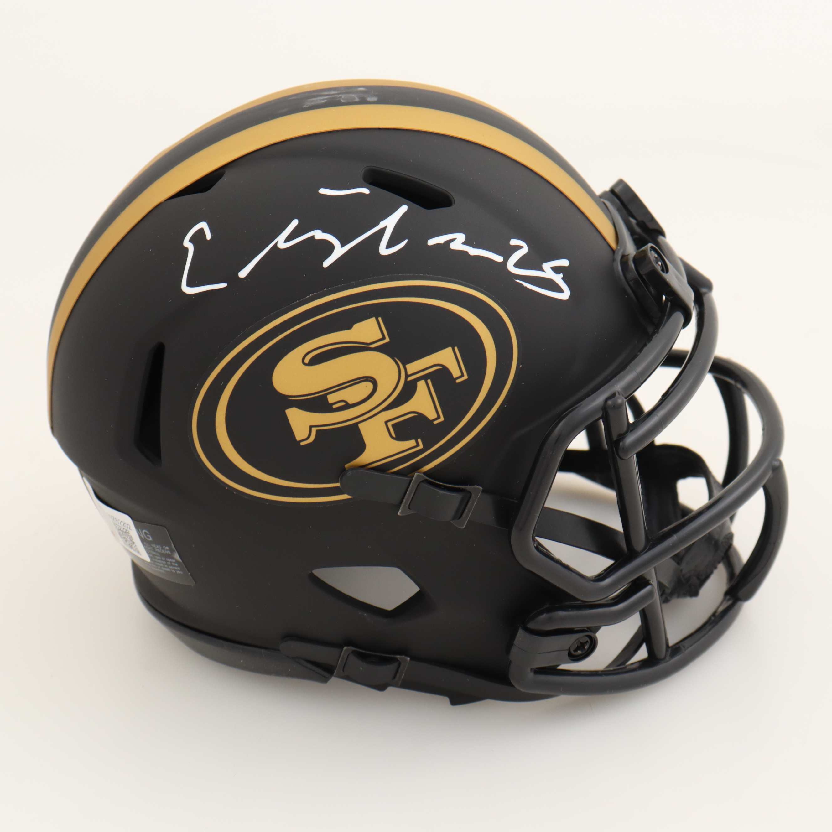 Riddell San Francisco 49ers Eclipse Alternate Speed mini helmet. Hand-signed by Elijah Mitchell.